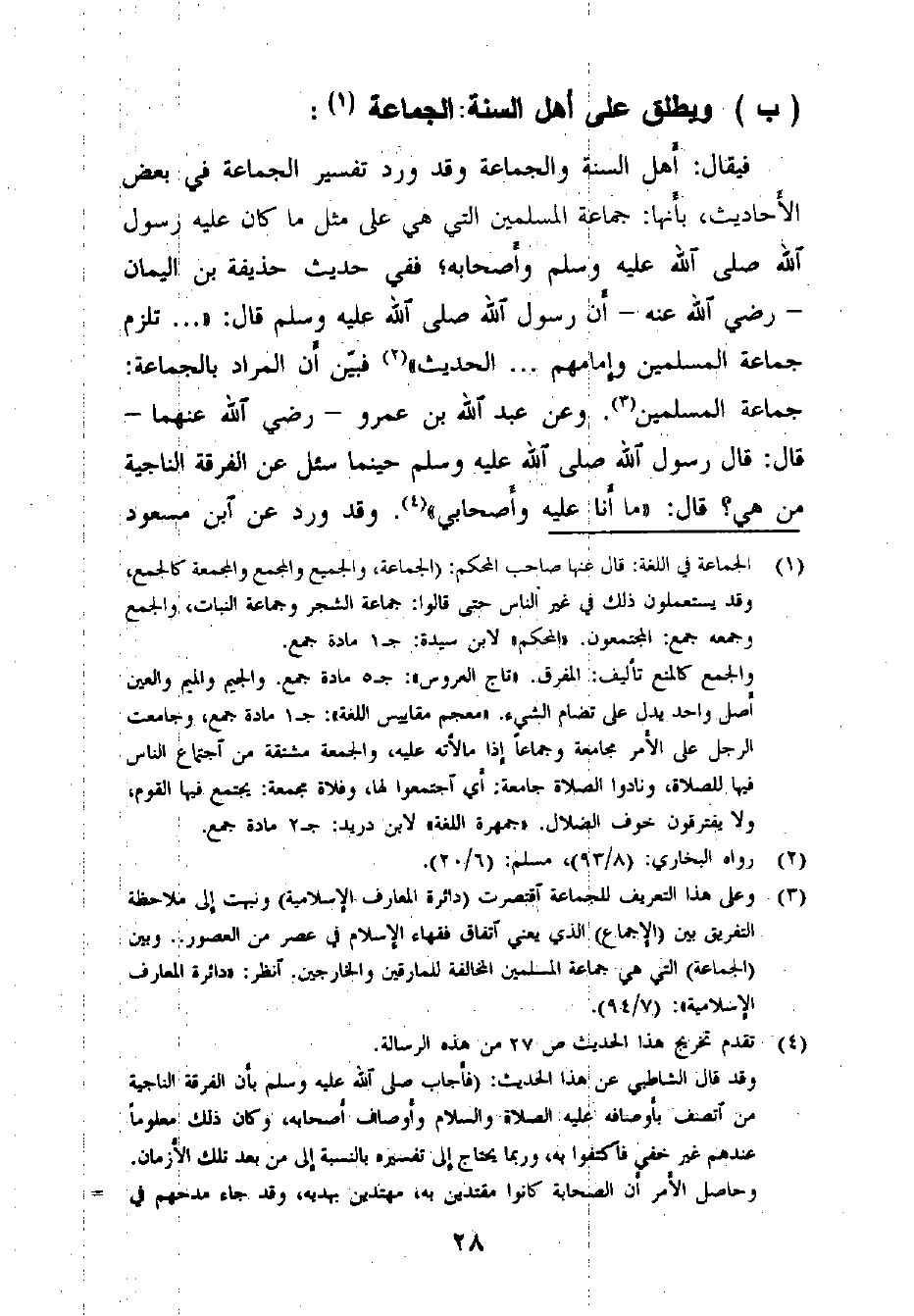 (¬3) وعلى هذا التعريف للجماعة اقتصرت (دائرة المعارف الإسلامية) ونبهت إلى ملاحظة التفريق بين (الإجماع) الذي يعني اتفاق فقهاء الإسلام في عصر من العصور.. وبين (الجماعة) التي هي جماعة المسلمين المخالفة للمارقين والخارجين. انظر: «دائرة المعارف الإسلامية» : (7/94) .