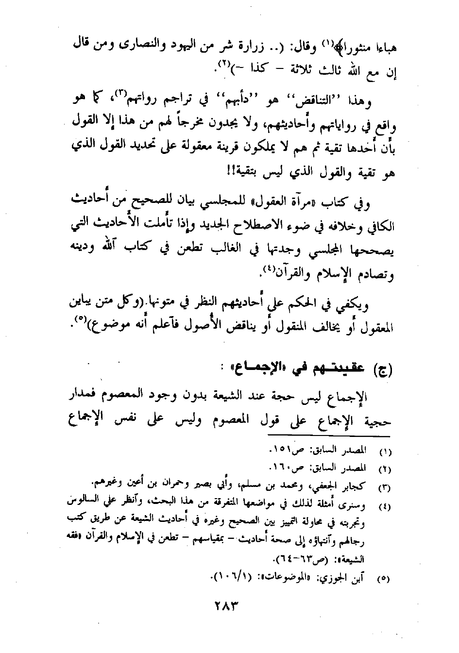 (¬4) وسنرى أمثلة لذلك في مواضعها المتفرقة من هذا البحث، وانظر علي السالوس وتجربته في محاولة التمييز بين الصحيح وغيره في أحاديث الشيعة عن طريق كتب رجالهم وانتهاؤه إلى صحة أحاديث - بمقياسهم - تطعن في الإسلام والقرآن. «فقه الشيعة» : (ص 63- 64) .