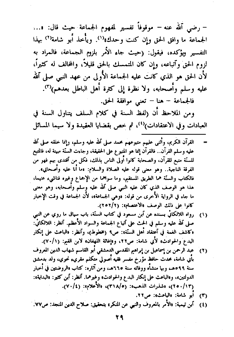 (موقوفاً تفسير لمفهوم الجماعة حيث قال: « ... الجماعة ما وافق الحق وإن كنت وحدك» (¬1) . ويأخذ أبو شامة (¬2) بهذا التفسير ويؤكده، فيقول: (حيث جاء الأمر بلزوم الجماعة، فالمراد به لزوم الحق واتباعه، وإن كان المتمسك بالحق قليلاً، والمخالف له كثيراً، لأن الحق هو الذي كانت عليه الجماعة الأولى من عهد النبي - صلى الله عليه وسلم - وأصحابه، ولا نظرة إلى كثرة أهل الباطل بعدهم) (¬3) .