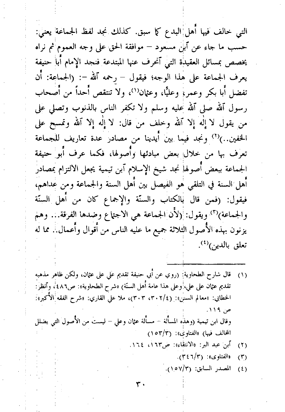 التي خالف فيها أهل البدع كما سبق. كذلك نجد لفظ الجماعة يعني: حسب ما جاء عن ابن مسعود - موافقة الحق على وجه العموم، ثم نراه يخصص بمسائل العقيدة التي انحرف عنها المبتدعة؛ فنجد الإمام أبا حنيفة يعرف الجماعة على هذا الوجه؛ فيقول - رحمه الله -: (الجماعة: أن تفضل أبا بكر وعمر، وعليّاً، وعثمان (¬1) ، ولا تنتقص أحداً من أصحاب رسول الله - صلى الله عليه وسلم - ولا تكفر الناس بالذنوب وتصلي على من يقول لا إله إلا الله وخلف من قال: لا إله إلا الله، وتمسح على الخفين..) (¬2) . ونجد فيما بين أيدينا من مصادر عدة تعاريف للجماعة تعرف بها من خلال بعض مبادئها وأصولها، فكما عرف أبو حنيفة الجماعة ببعض أصولها نجد شيخ الإسلام ابن تيمية يجعل الالتزام بمصادر أهل السنة في التلقي هو الفيصل بين أهل السنة والجماعة ومن عداهم، فيقول: (فمن قال بالكتاب والسنّة والإجماع كان من أهل السنّة والجماعة) (¬3) ويقول: (لأن الجماعة هي الاجتماع وضدها الفرقة ... وهم يزنون بهذه الأصول الثلاثة جميع ما عليه الناس من أقوال وأعمال.. مما له تعلق بالدين) (¬4) .