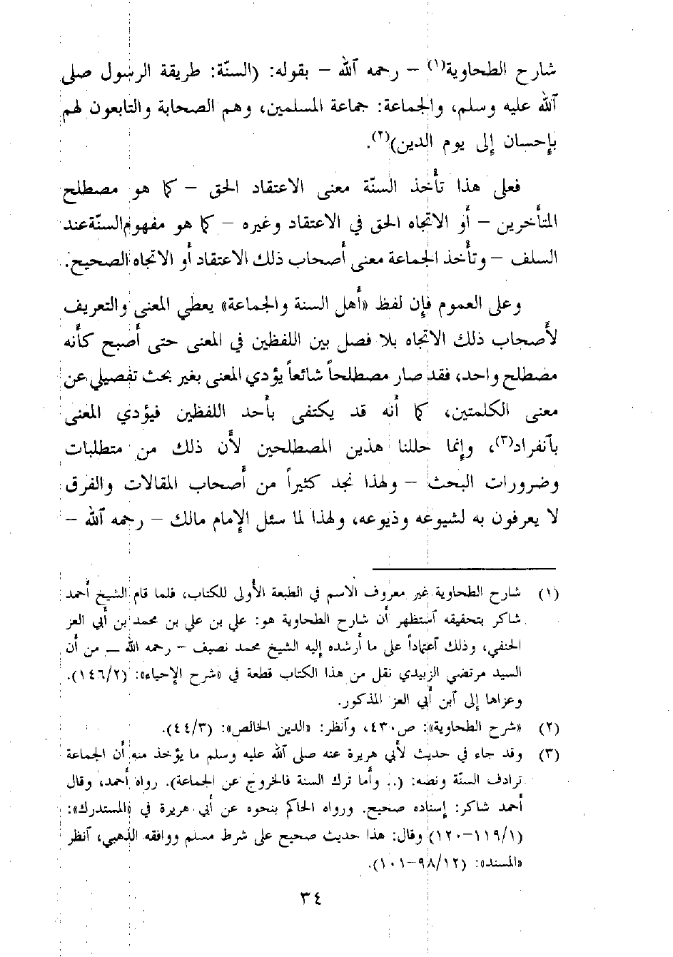 (¬3) وقد جاء في حديث لأبي هريرة عنه (ما يؤخذ منه أن الجماعة ترادف السنّة ونصه: (.. وأما ترك السنة فالخروج عن الجماعة) . رواه أحمد، وقال أحمد شاكر: إسناده صحيح. ورواه الحاكم بنحوه عن أبي هريرة في «المستدرك» : (1/119 - 120) وقال: هذا حديث صحيح على شرط مسلم، ووافقه الذهبي، انظر «المسند» : (12/98 - 101) .