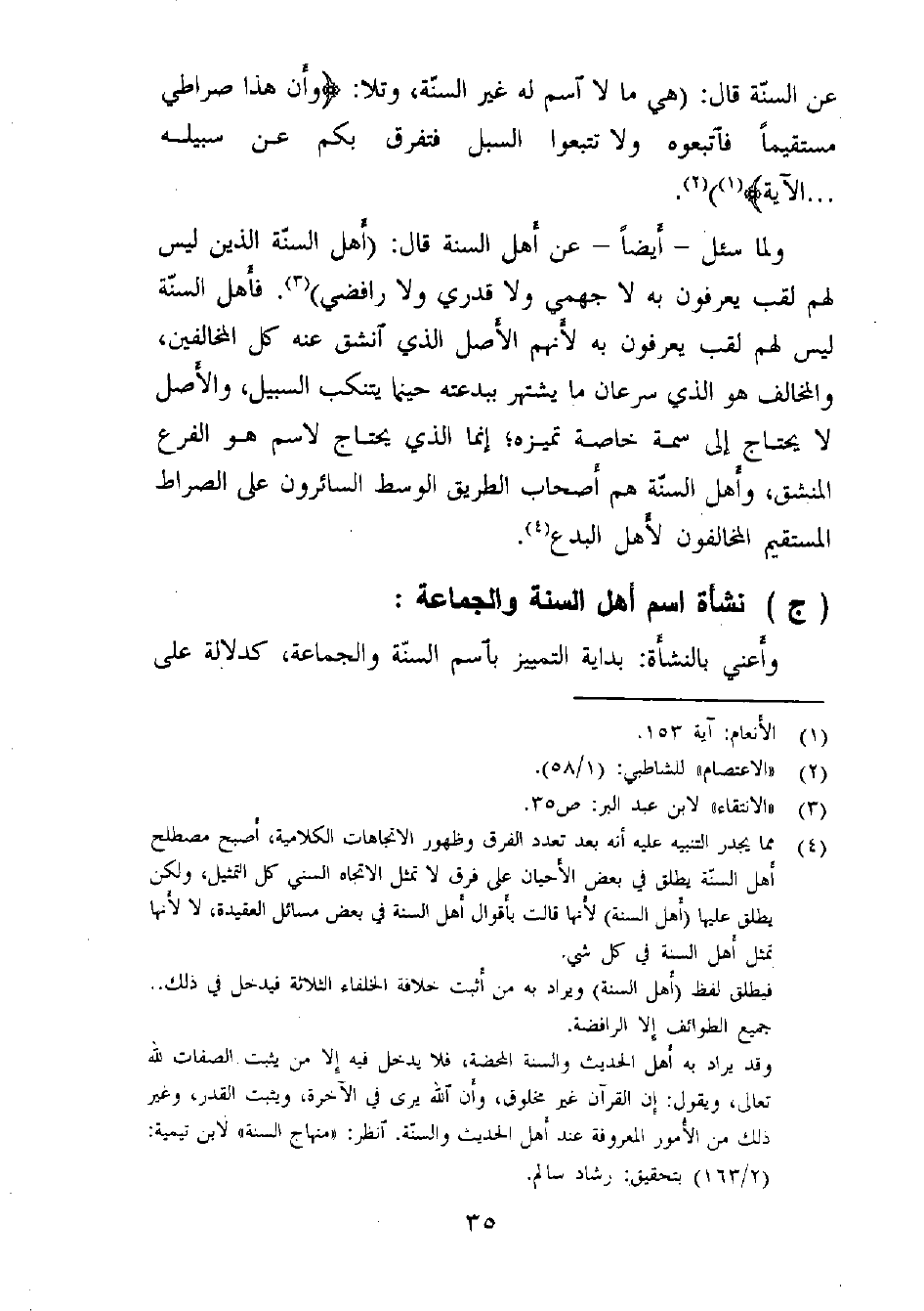 (¬6) مما يجدر التنبيه عليه أنه بعد تعدد الفرق وظهور الاتجاهات الكلامية، أصبح مصطلح أهل السنّة يطلق في بعض الأحيان على فرق لا تمثل الاتجاه السني كل التمثيل، ولكن يطلق عليها (أهل السنة) لأنها قالت بأقوال أهل السنة في بعض مسائل العقيدة، لا لأنها تمثل أهل السنة في كل شيء.
