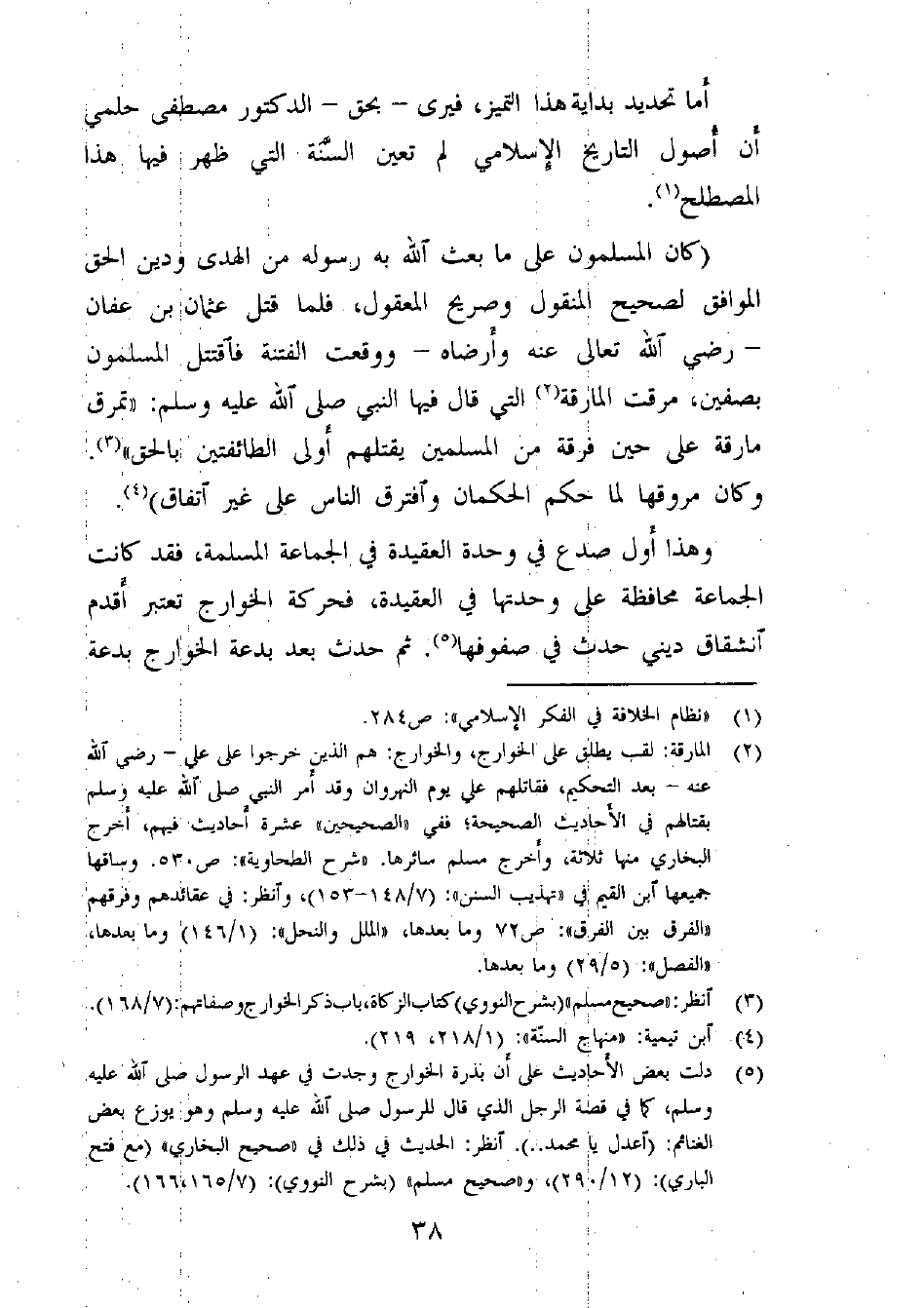 (¬5) دلت بعض الأحاديث على أن بذرة الخوارج وجدت في عهد الرسول - صلى الله عليه وسلم -، كما في قصة الرجل الذي قال للرسول (وهو يوزع بعض الغنائم: (اعدل يا محمد..) . انظر: الحديث في ذلك في «صحيح البخاري» (مع فتح الباري) : (12/290) ، و «صحيح مسلم» (بشرح النووي) : (7/165، 166) .