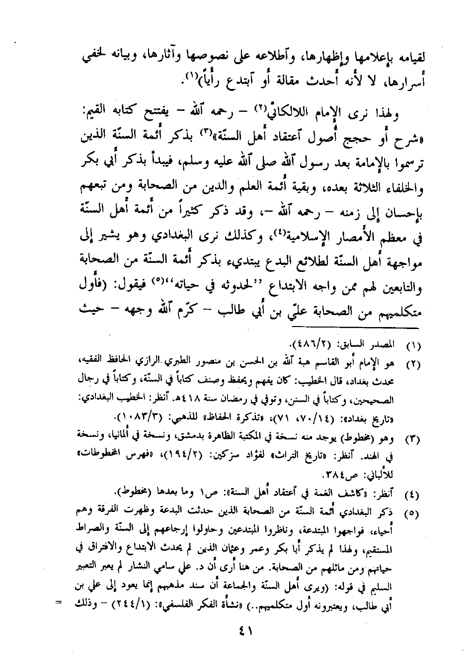 ولهذا نرى الإمام اللالكائي (¬2) - رحمه الله - يفتتح كتابه القيّم: «شرح أو حجج أُصول اعتقاد أهل السنّة» (¬3) بذكر أئمة السنّة الذين ترسموا بالإمامة بعد رسول الله - صلى الله عليه وسلم -، فيبدأ بذكر أبي بكر والخلفاء الثلاثة بعده، وبقية أئمة العلم والدين من الصحابة ومن تبعهم بإحسان إلى زمنه - رحمه الله -، وقد ذكر كثيراً من أئمة أهل السنّة في معظم الأمصار الإسلامية (¬4) ، وكذلك نرى البغدادي وهو يشير إلى مواجهة أهل السنّة لطلائع البدع يبتدئ بذكر أئمة السنّة من الصحابة والتابعين لهم ممن واجه الابتداع "لحدوثه في حياته'' (¬5) فيقول: (فأول متكلميهم من الصحابة عليّ بن أبي طالب - كرّم الله وجهه - حيث