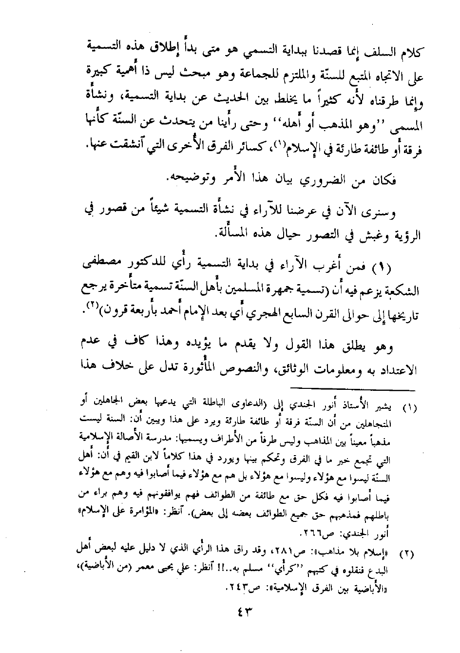 كلام السلف، إنما قصدنا ببداية التسمي هو متى بدأ إطلاق هذه التسمية على الاتجاه المتبع للسنّة والملتزم للجماعة، وهو مبحث ليس ذا أهمية كبيرة وإنما طرقناه لأنه كثيراً ما يخلط بين الحديث عن بداية التسمية ونشأة المسمى "وهو المذهب أو أهله"، وحتى رأينا من يتحدث عن السنّة كأنها فرقة أو طائفة طارئة في الإسلام (¬1) ، كسائر الفرق الأُخرى التي انشقت عنها.