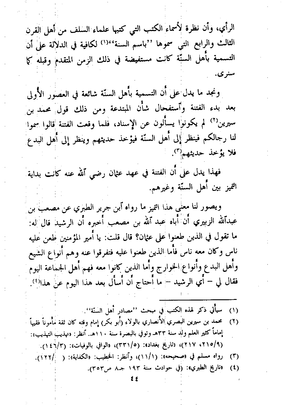 ونجد ما يدل على أن التسمية بأهل السنّة شائعة في العصور الأولى بعد بدء الفتنة واستفحال شأن المبتدعة؛ ومن ذلك قول محمد بن سيرين (¬2) : لم يكونوا يسألون عن الإسناد، فلما وقعت الفتنة قالوا: سموا لنا رجالكم، فينظر إلى أهل السنّة فيؤخذ حديثهم وينظر إلى أهل البدع فلا يؤخذ حديثهم (¬3) .