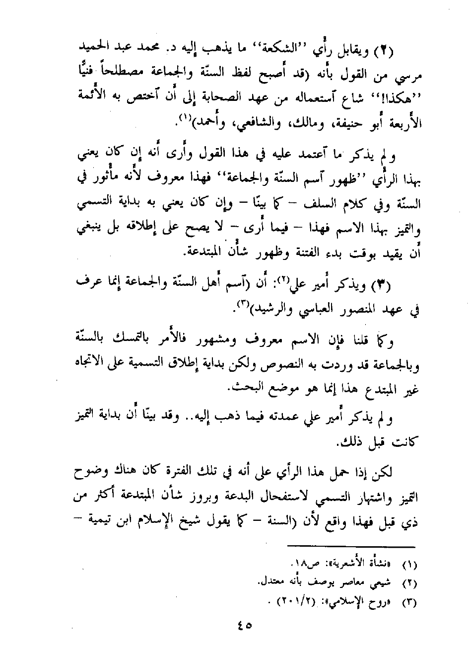 2- ويقابل رأي "الشكعة" ما يذهب إليه د. محمد عبد الحميد مرسي من القول بأنه (قد أصبح لفظ السنّة والجماعة مصطلحاً فنّياً "هكذا! " شاع، استعماله من عهد الصحابة إلى أن اختص به الأئمة الأربعة؛ أبو حنيفة، ومالك، والشافعي، وأحمد) (¬1) .