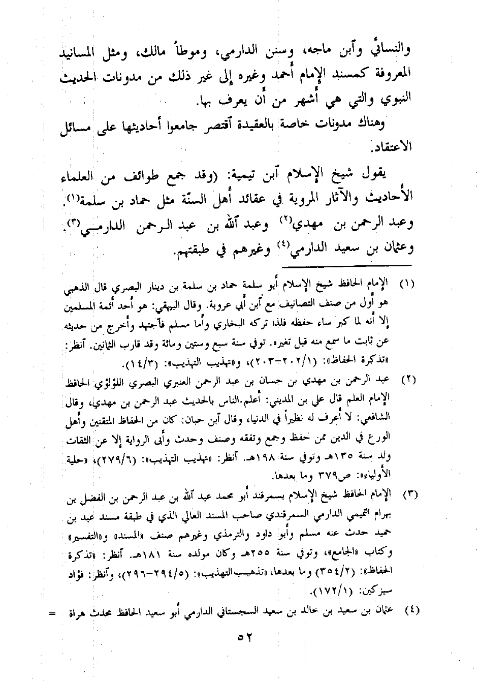 يقول شيخ الإسلام ابن تيمية: (وقد جمع طوائف من العلماء الأحاديث والآثار المروية في عقائد أهل السنّة مثل حماد بن سلمة (¬1) ، وعبد الرحمن بن مهدي (¬2) ، وعبد الله بن عبد الرحمن الدارمي (¬3) ، وعثمان بن سعيد الدارمي (¬4) وغيرهم في طبقتهم.