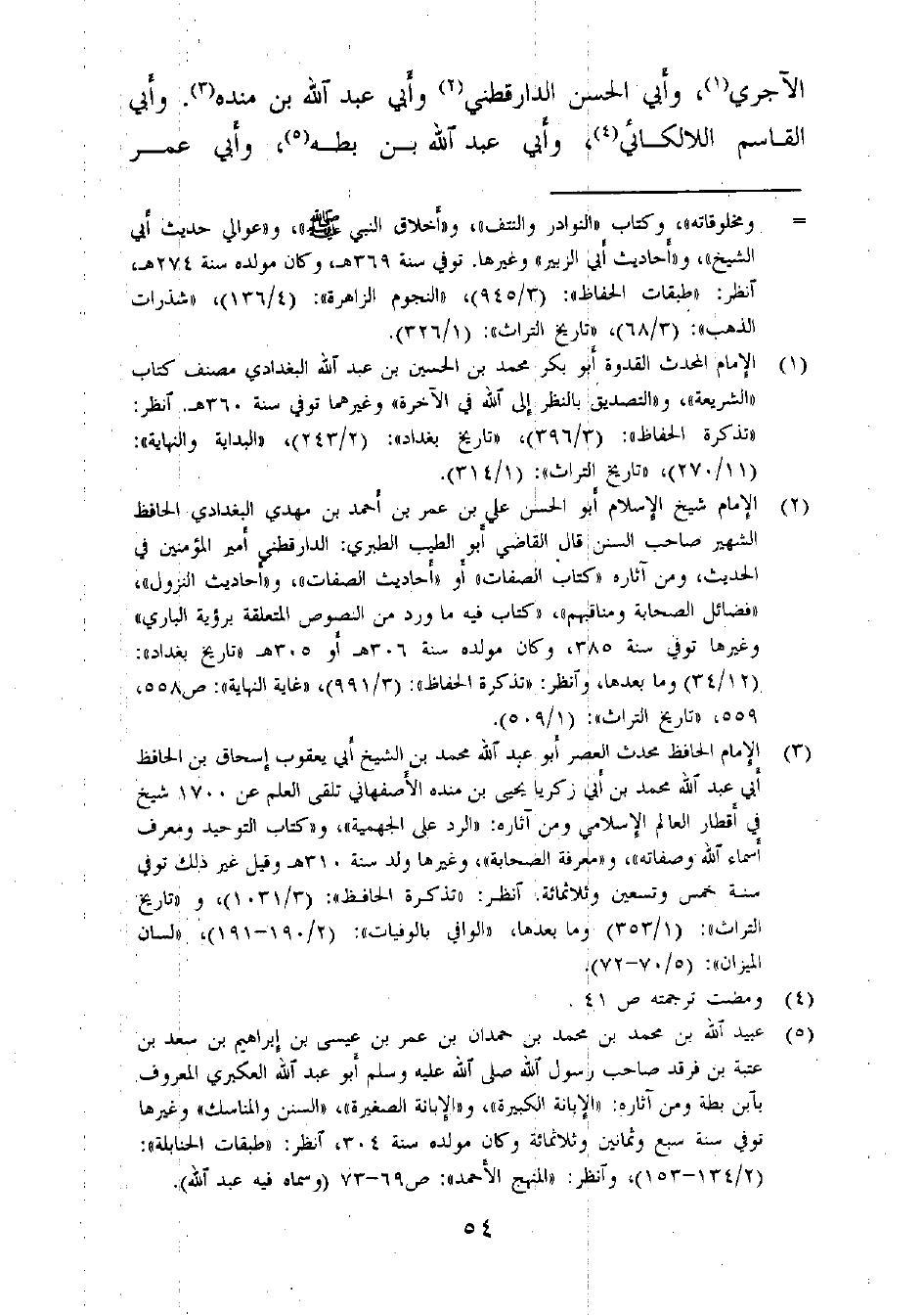 الآجري (¬1) ، وأبي الحسن الدارقطني (¬2) وأبي عبد الله بن منده (¬3) ، وأبي القاسم اللالكائي (¬4) ، وأبي عبد الله بن بطه (¬5) ، وأبي عمر