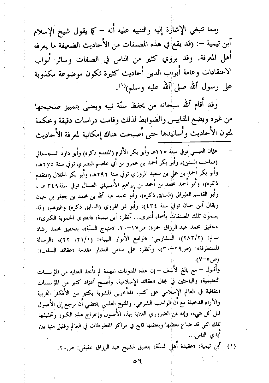 وأقول - مع بالغ الأسف - إن هذه المدونات المهمة لم تأخذ العناية من المؤسسات التعليمية والباحثين في مجال العقائد الإسلامية، وأصبح اعتماد كثير من المؤسسات الثقافية في العالم الإسلامي على كتب المتأخرين المشوبة بكثير من الأفكار الغريبة والآراء الدخيلة، مع أن الواجب الشرعي والمنهج العلمي يقتضي أن نرجع إلى الأصول قبل كل شيء، وإنه لمن الضروري العناية بهذه الأصول وإخراج هذه الكنوز وتحقيقها، تلك التي قد ضاع بعضها وبعضها قابع في مراكز المخطوطات في العالم وقليل منها بين أيدي الناس ...