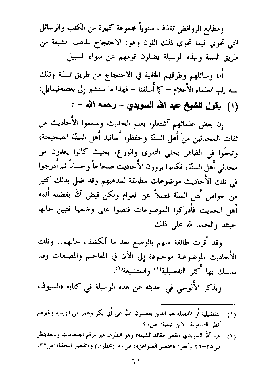 (¬2) عبد الله السويدي «نقض عقائد الشيعة» وهو مخطوط غير مرقم الصفحات وبالعد ينظر ص 25 - 26 وانظر: «مختصر الصواعق» : ص 50 (مخطوط) و «مختصر التحفة» : ص 32.