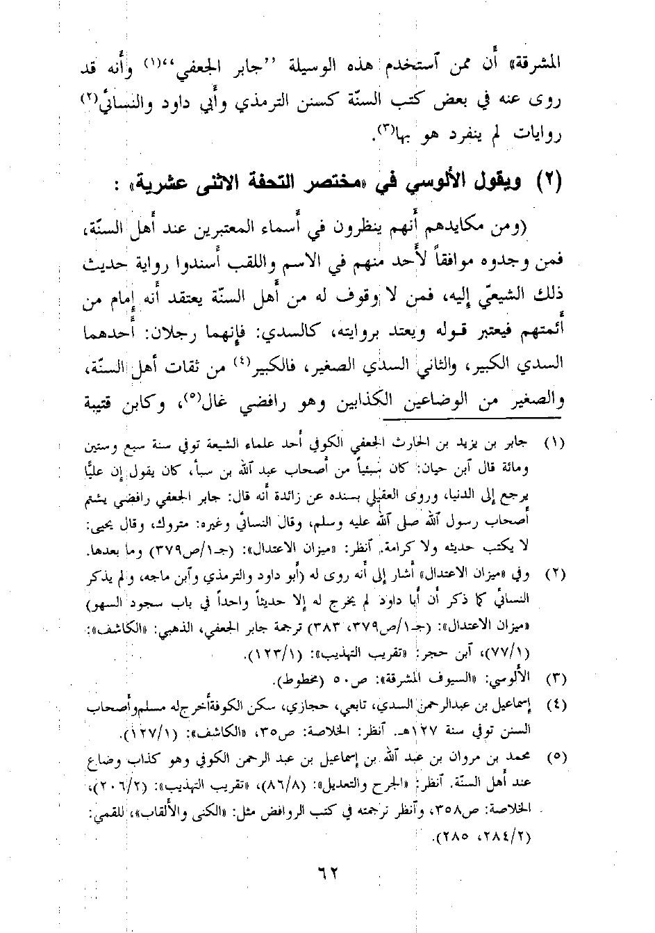 (¬1) جابر بن يزيد بن الحارث الجعفي الكوفي أحد علماء الشيعة، توفي سنة سبع وستين ومائة، قال ابن حبان: كان سبئياً من أصحاب عبد الله بن سبأ، كان يقول إن عليّاً يرجع إلى الدنيا، وروى العقيلي بسنده عن زائدة أنه قال: جابر الجعفي رافضي يشتم أصحاب رسول الله - صلى الله عليه وسلم -، وقال النسائي وغيره: متروك، وقال يحيى: لا يكتب حديثه ولا كرامة. انظر: «ميزان الاعتدال» : (جـ1/ ص 379) وما بعدها.