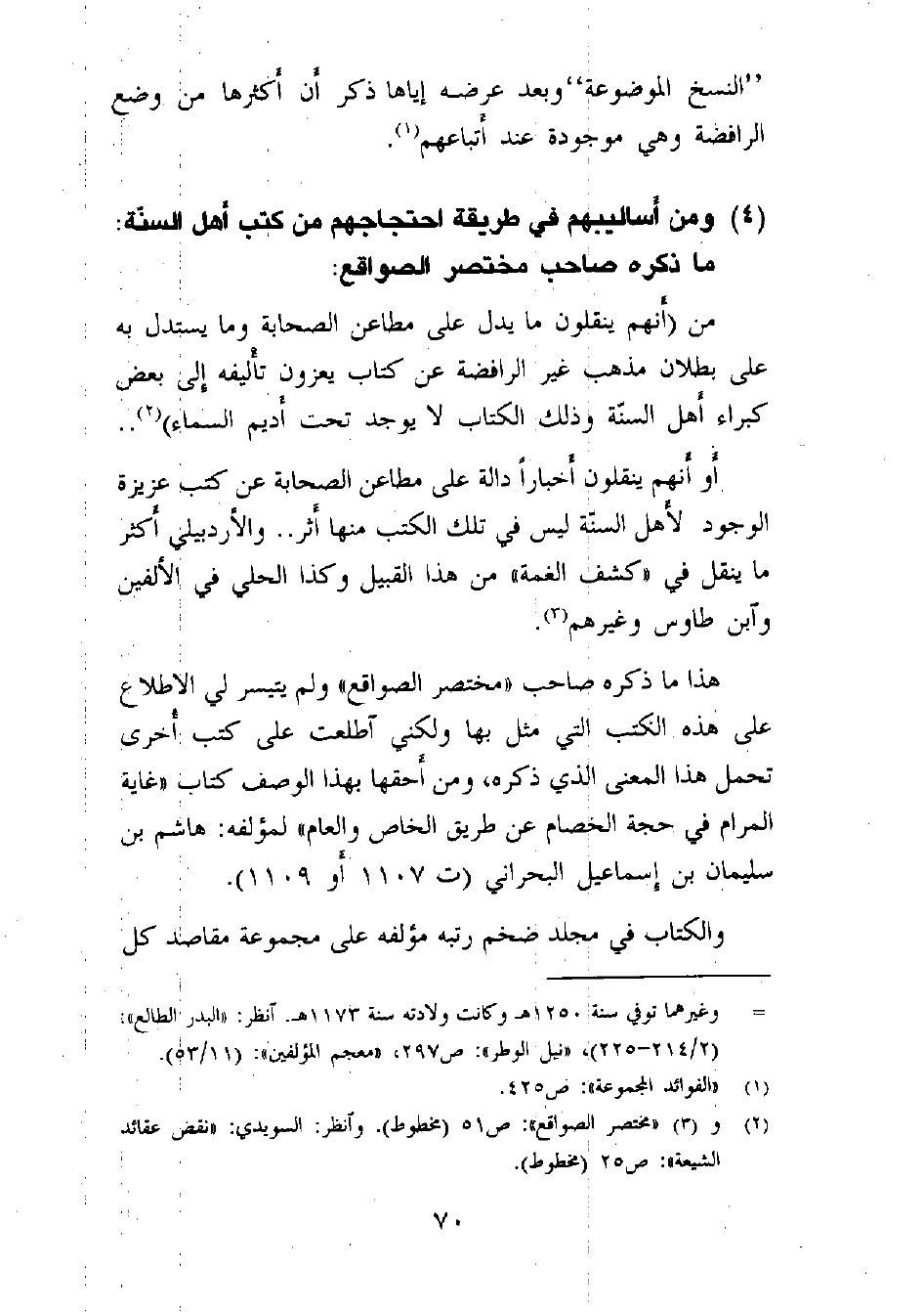 هذا ما ذكره صاحب «مختصر الصواقع» ولم يتيسر لي الاطلاع على هذه الكتب التي مثل بها، ولكني اطلعت على كتب أخرى تحمل هذا المعنى الذي ذكره، ومن أحقها بهذا الوصف كتاب «غاية المرام في حجة الخصام عن طريق الخاص والعام» لمؤلفه: هاشم بن سليمان بن إسماعيل البحراني (ت 1107 أو 1109) .