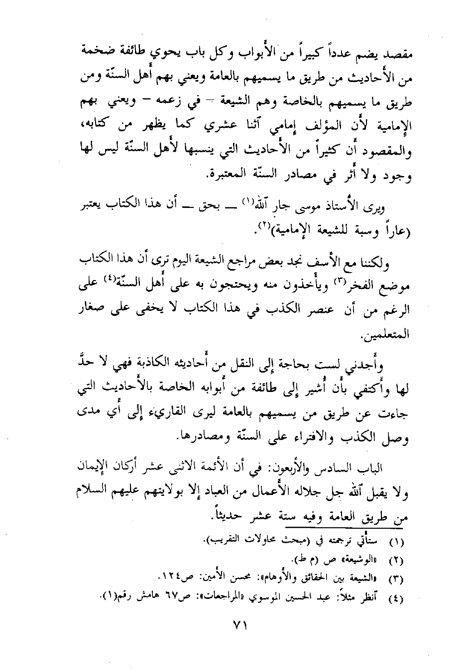 ويرى الأستاذ موسى جار الله (¬1) - بحق - أن هذا الكتاب يعتبر (عاراً وسبة للشيعة الإمامية) (¬2) .
