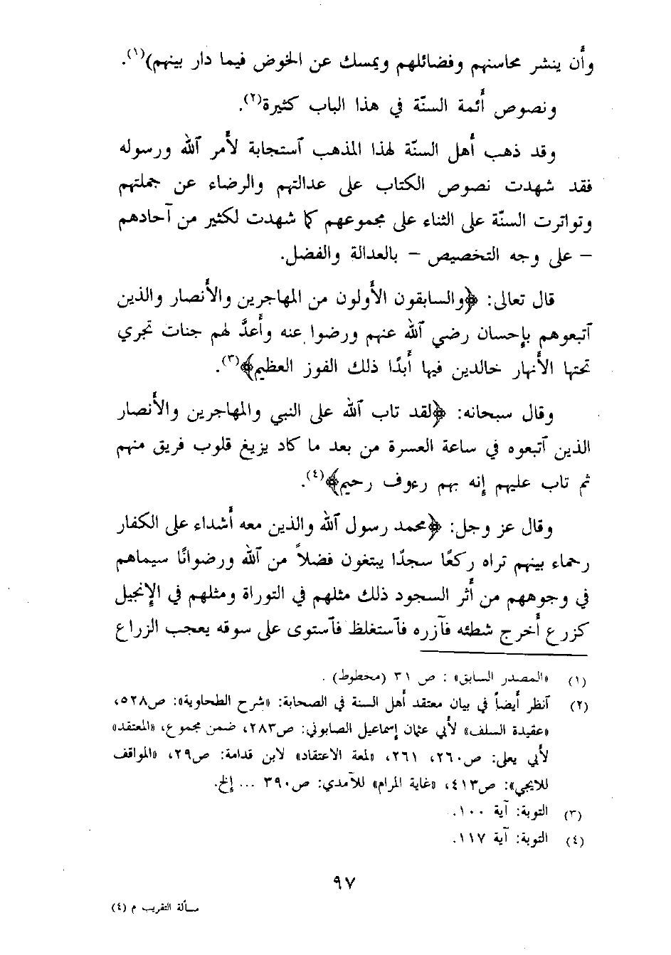 (¬2) انظر أيضاً في بيان معتقد أهل السنة في الصحابة: «شرح الطحاوية» : ص 528، «عقيدة السلف» لأبي عثمان إسماعيل الصابوني: ص 283، ضمن مجموع، «المعتقد» لأبي يعلى: ص 260، 261، «لمعة الاعتقاد» لابن قدامة: ص 29، «المواقف للايجي» : ص 413، «غاية المرام» للآمدي: ص 390 ... إلخ.