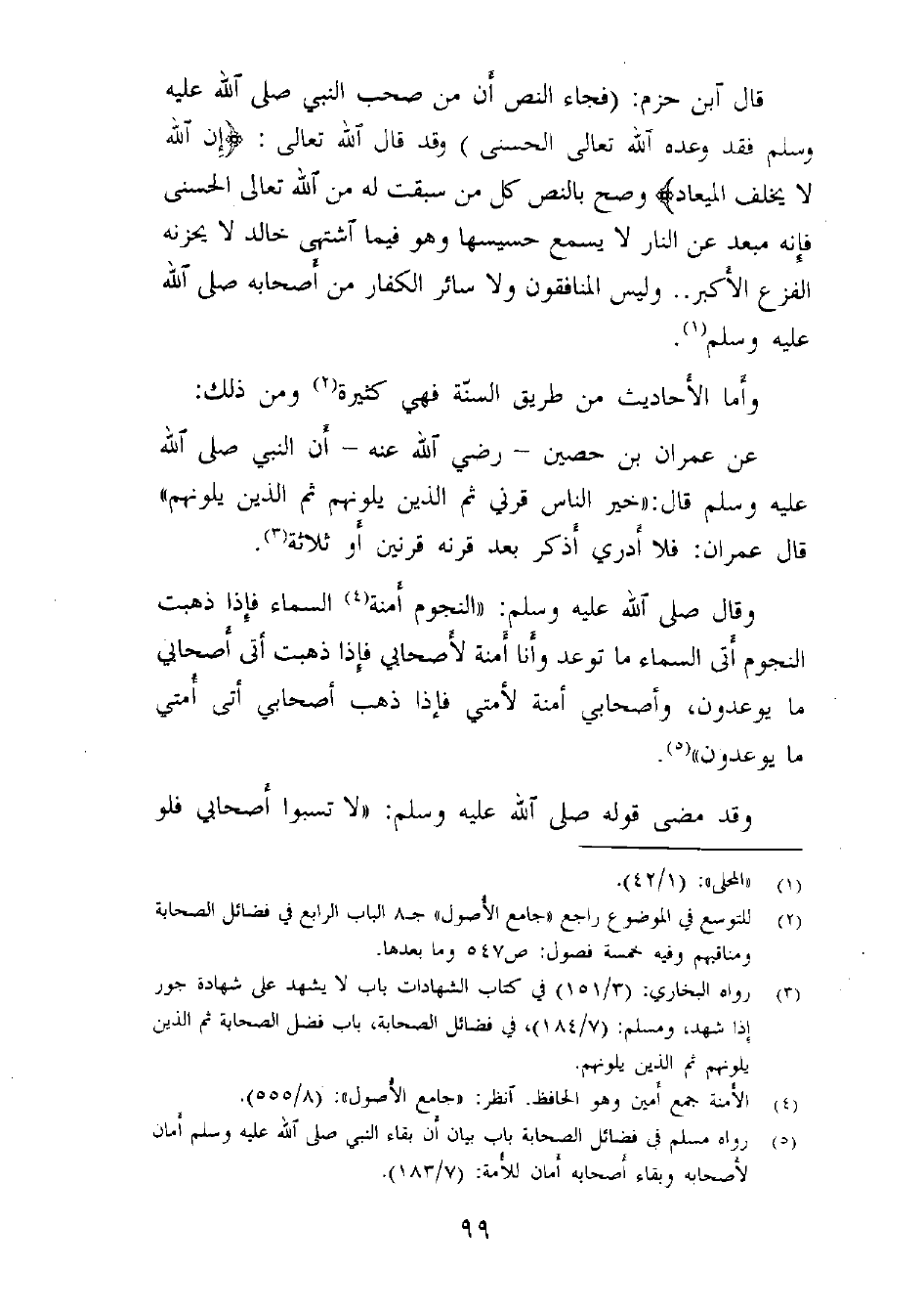 قال ابن حزم: (فجاء النص أن من صحب النبي - صلى الله عليه وسلم - فقد وعده الله تعالى الحسنى) وقد قال الله تعالى: (إِنَّ اللَّهَ لَا يُخْلِفُ الْمِيعَادَ) ، وصح بالنص كل من سبقت له من الله تعالى الحسنى فإنه مبعد عن النار لا يسمع حسيسها وهو فيما اشتهى خالد لا يحزنه الفزع الأكبر.. وليس المنافقون ولا سائر الكفار من أصحابه ((¬1) .