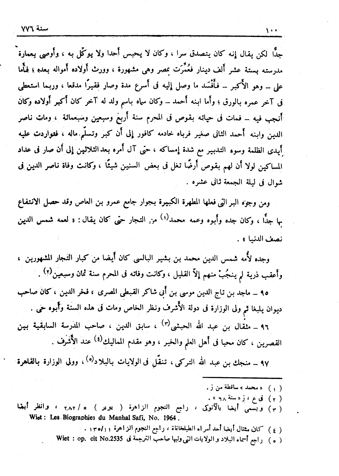 جداً لكن يقال: إنه كان يتصدق سراً. وكان لا يحبس أحداً ولا يوكل به، وأوصى بعمارة مدرسة بستة عشر ألف دينار فعمرت بمصر هي مشهورة وورثت أولاده أمواله بعده، فأما علي وهو الأكبر فأفسدها ما وصل إليه في أسرع مدة وصار فقيراً مدقعاً وربما استعطى في آخر عمره بالورق، وأما ابنه أحمد وكان سماه باسم ولد له آخر كان أكبر أولاده، وكان أنجب فيه، فمات في حياته بقوص في المحرم سنة أربع وسبعين وسبعمائة، ومات ناصر الدين وابنه أحمد الثاني صغير. فرباه خادمه كافور إلى أن كبر وتسلم ماله، فتواردت عليه أيدي الظلمة وسوء التدبير مع شدة إمساكه حتى آل أمره بعد الثلاثين إلى أن صار في عداد المساكين لولا أن لهم بقوص أرضاً تغل في بعض السنين شيئاً، وكانت وفاة ناصر الدين في شوال في ليلة الجمعة ثاني عشره. ومن وجوه البر التي فعلها: المطهرة الكبيرة جوار جامع عمرو بن العاص، وقد حصل الانتفاع بها جداً، وكان جده وأبوه وعمه محمد من التجار حتى كان يقال لعمه شمس الدين: نصف الدنيا، وجده لأمه شمس الدين محمد بن يسير البالسي كان أيضاً من كبار التجار المشهورين، وأعقب ذرية لم ينجب منهم، إلا القليل، وكانت وفاته في المحرم سنة ثمان وستين رحمهم الله أجمعين.