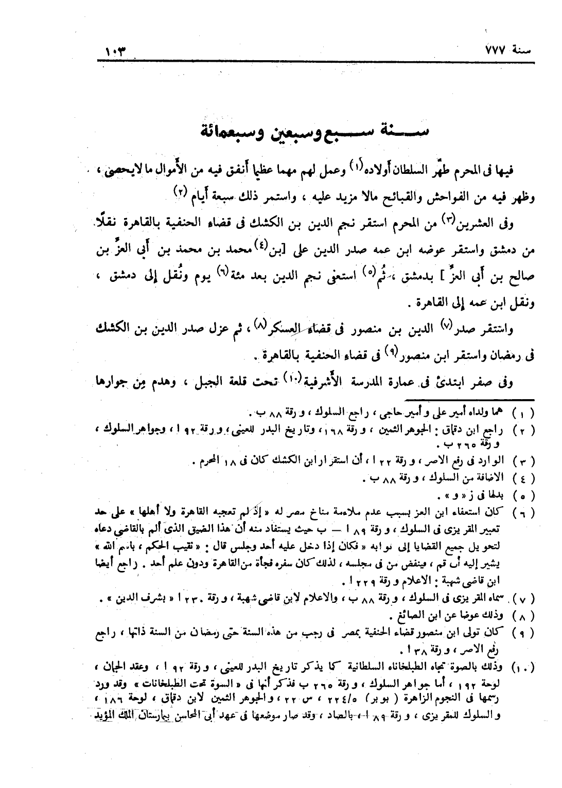 وفي العشرين من المحرم استقر نجم الدين بن الكشك في قضاء الحنفية بالقاهرة نقلاً من دمشق، واستقر عوضه ابن عمه صدر الدين على دمشق، ثم استغنى نجم الدين بعد مائة يوم ونقل إلى دمشق، ونقل ابن عمه إلى القاهرة، واستقر صدر الدين بن منصور في قضاء العسكر، ثم عزل صدر الدين بن الكشك في رمضان واستقر ابن منصور في قضاء الحنفية بالقاهرة.