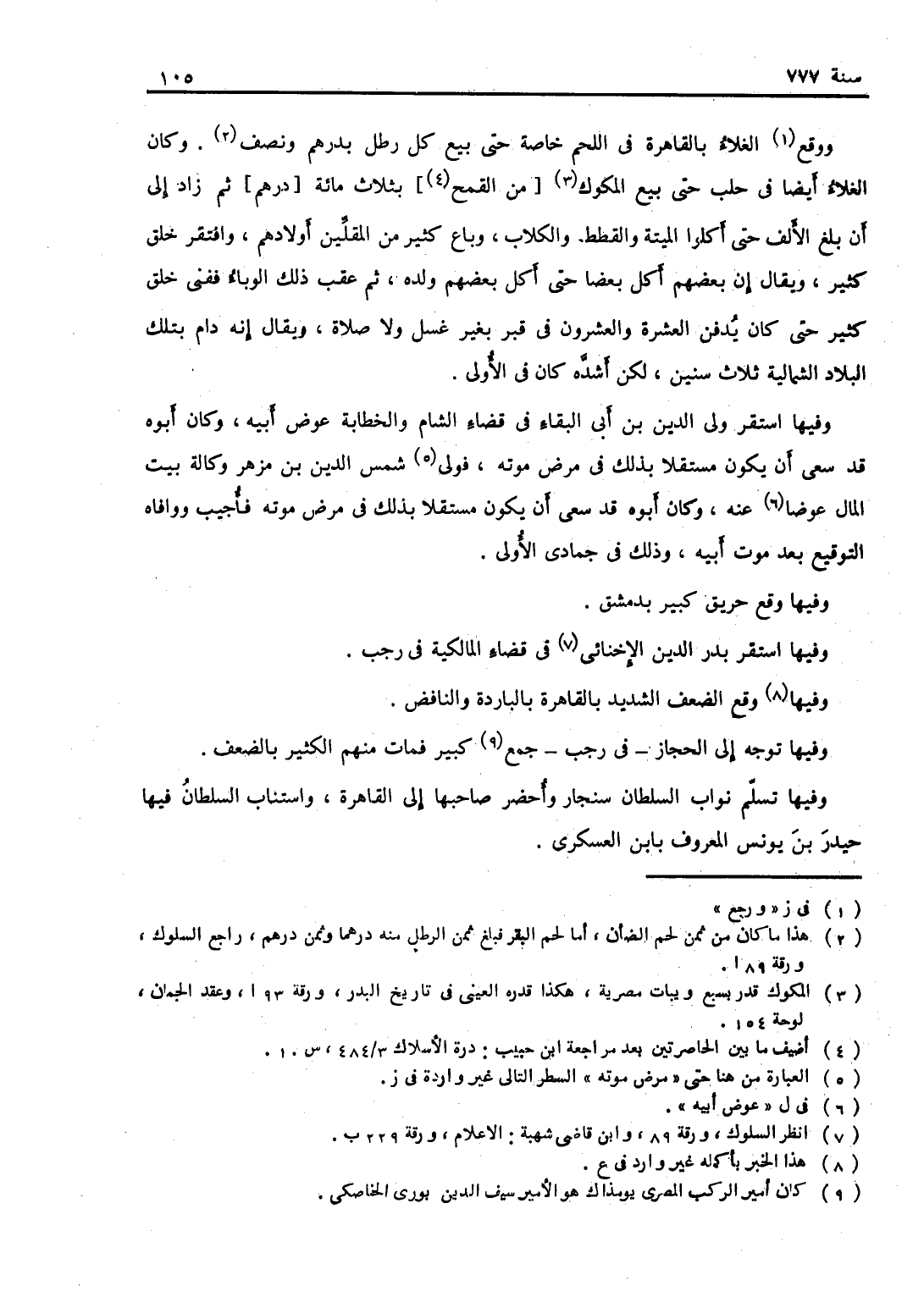 وكان الغلاء أيضاً في حلب حتى بيع المكوك بثلاثمائة، ثم زاد إلى أن بلغ الألف حتى أكلوا الميتة والقطاط والكلاب، وباع كثير من المقلين أولادهم، وافتقر خلق كثير، ويقال: إن بعضهم أكل بعضاً حتى أكل بعضهم ولده، ثم عقب بعد ذلك الوباء ففني خلق كثير حتى كان يدفن العشرة والعشرون في قبر بغير غسل ولا صلاة، ويقال: إنه دام بتلك البلاد الشامية ثلاث سنين، لكن أشده كان في الأولى.