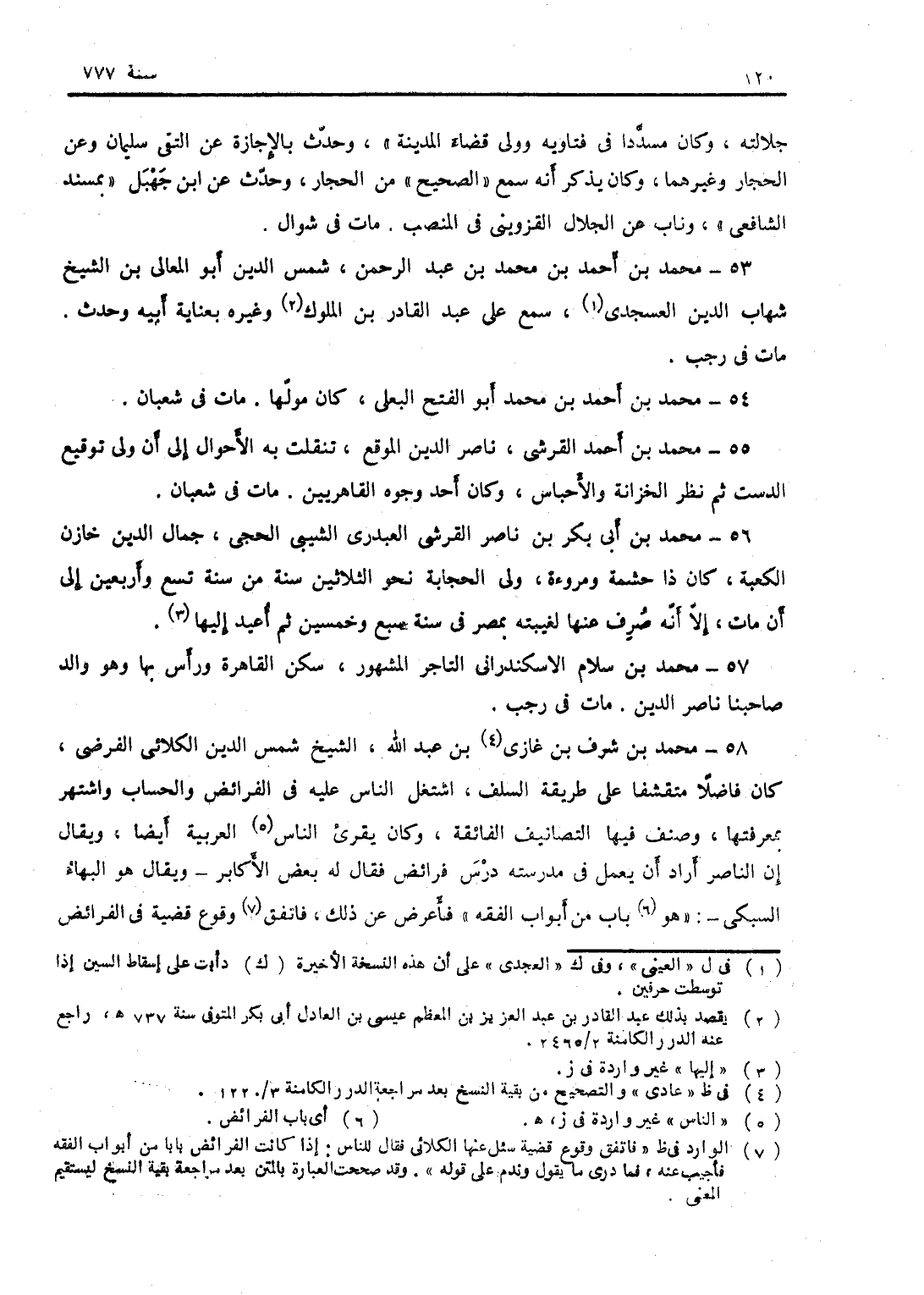 محمد بن شرف بن عادي بن عبد الله، الشيخ شمس الدين الكلائي الفرضي، كان فاضلاً متقشفاً على طريقة السلف، اشتغل الناس عليه في الفرائض والحساب واشتهر بمعرفتها وصنف فيها التصانيف الفائقة، وكان يقرئ العربية أيضاً. ويقال: إن الناصر أراد أن يعمل في مدرسته درس فرائض فقال له بعض الأكابر ويقال هو البهاء السبكي: هو باب من أبواب الفقه، فأعرض عن ذلك فاتفق وقوع قضية مشكلة في الفرائض
