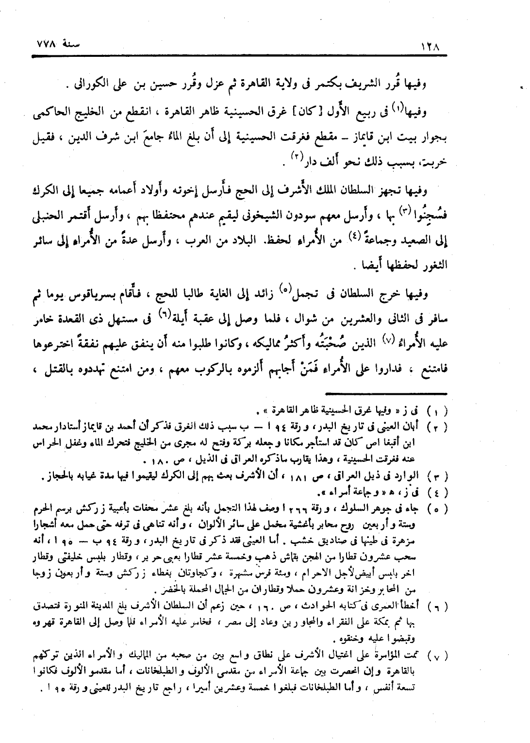 وفيها خرج السلطان في تجمل زائد إلى الغاية طالباً للحج فأقام بسر ياقوس يوماً ثم سافر في الثاني والعشرين من شوال، فلما وصل عقبة أيلة في مستهل ذي القعدة خامر عليه الأمراء الذين صحبته وأكثر مماليكه وكانوا طلبوا منه أن ينفق عليهم نفقة اخترعوها فامتنع فداروا على الأمراء فمن أجابهم ألزموه بالركوب معهم ومن امتنع تهددوه بالقتل