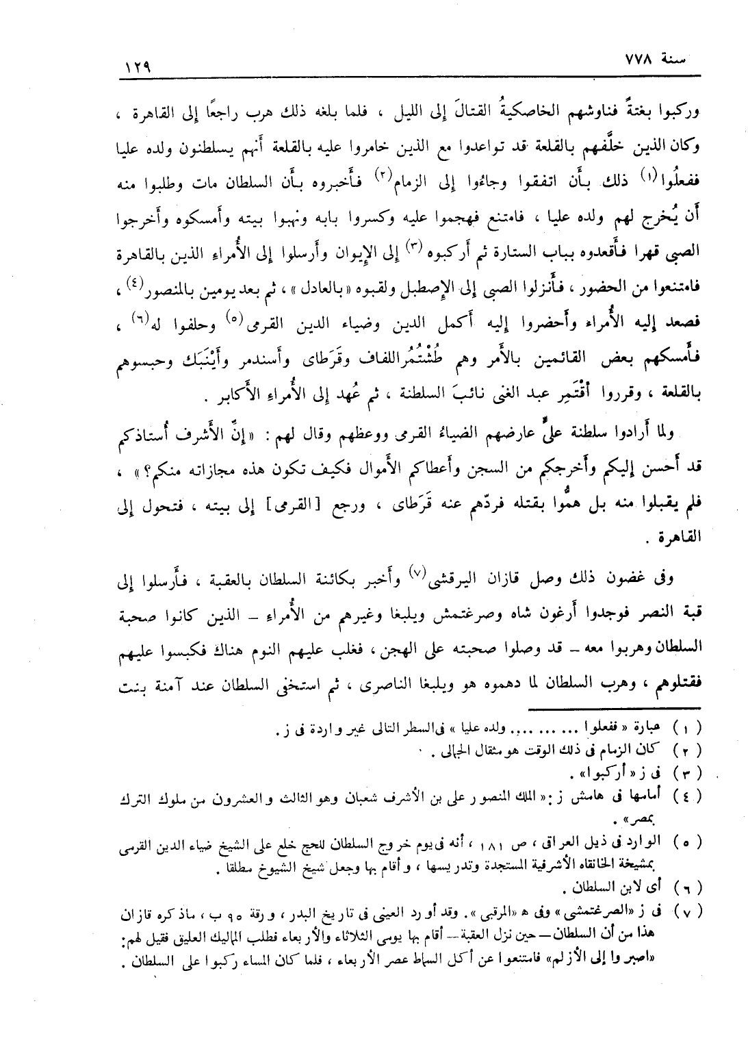 وركبوا بغتة فناوشهم الخاصكية القتال إلى الليل، فلما بلغه ذلك هرب راجعاً إلى القاهرة، وكان الذين خلفهم بالقلعة قد تواعدوا مع الذين خامروا عليه بالعقبة أنهم يسلطنون ولده علياً ففعلوا ذلك بأن اتفقوا وجاؤوا إلى الزمام فأخبروه أن السلطان مات وطلبوا منه أن يخرج لهم ولده علياً فامتنع فهجموا عليه وكسروا بابه ونهبوا بيته وأمسكوه وأخرجوا الصبي قهراً فأقعدوه بباب الستارة. ثم أركبوه إلى الإيوان وأرسلوا إلى الأمراء الذين بالقاهرة فامتنعوا من الحضور فأنزلوا الصبي إلى الأصطبل ولقبوه بالعادل ثم بعد يومين بالمنصور فصعد إليه الأمراء وأحضروه إليه أكمل الدين وضياء الدين القرمي وحلفوا له، فأمسكهم بعض القائمين بالأمر وهم طشتمر اللفاف وقرطاي وأسندمر وأينبك، وحبسوهم بالقلعة وقروا آقتمر عبد الغني نائب السلطنة، ثم عهد إلى الأمراء الأكابر، ولما أرادوا سلطنة علي عارضهم الضياء القرمي ووعظهم وقال لهم: إن الأشراف أستاذكم قد أحسن إليكم وأخرجكم من السجن وأعطاكم الأموال فكيف تكون هذه مجازاته منكم؟ فلم يقبلوا منه بل هموا بقتله فردهم عنه قرطاي ورجع إلى بيته فتحول إلى القاهرة، وفي غضون ذلك وصل قازان الصرغتمشي فأخبر بكائنه السلطان بالعقبة فأرسلوا إلى قبة النصر فوجدوا أرغون شاه وصرغتمش ويلبغا وغيرهم من الأمراء الذين كانوا صحبة السلطان وهربوا معه قد وصلوا صحبته على الهجن فغلب عليهم النوم هناك فكبسوا عليهم فقتلوهم، وهرب السلطان لما دهموه هو ويلبغا الناصري، ثم استخفى السلطان عند آمنة بنت