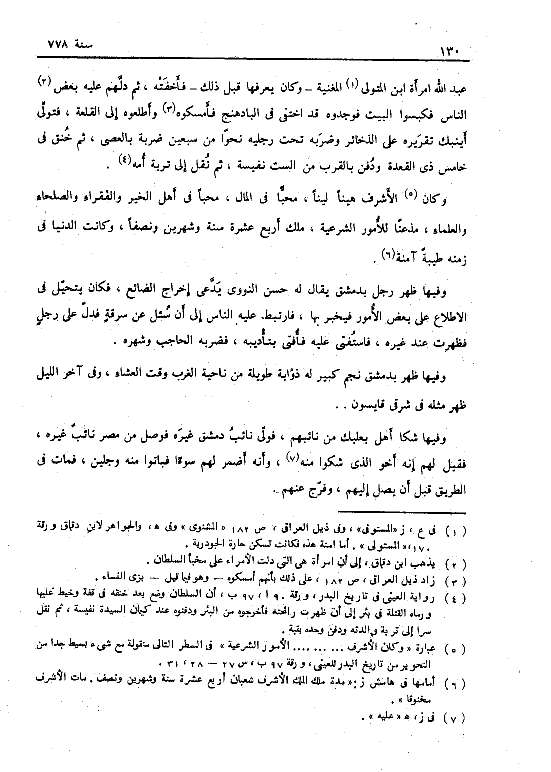 عبد الله امرأة ابن المستوفي المغينة كان يعرفها قبل ذلك فأخفته، ثم دلهم عليه بعض الناس فكبسوا البيت فوجدوه قد اختفى في البادهنج فأمسكوه واطلعوه إلى القلعة فتولى أينبك تقريقه على الذخائر وضربه تحت رجليه نحواً من سبعين ضربة بالعصي، ثم خنق في خامس ذي القعدة ودفن بالقرب من الست نفيسة ثم نقل إلى تربة أمه. وكان الأشرف هيناً ليناً محباً في المال في أهل الخير والفقراء والصلحاء والعلماء مذعناً للأمور الشرعية، ملك أربع عشرة سنة وشهرين ونصفاً، وكانت الدنيا في زمانه طيبة آمنة.