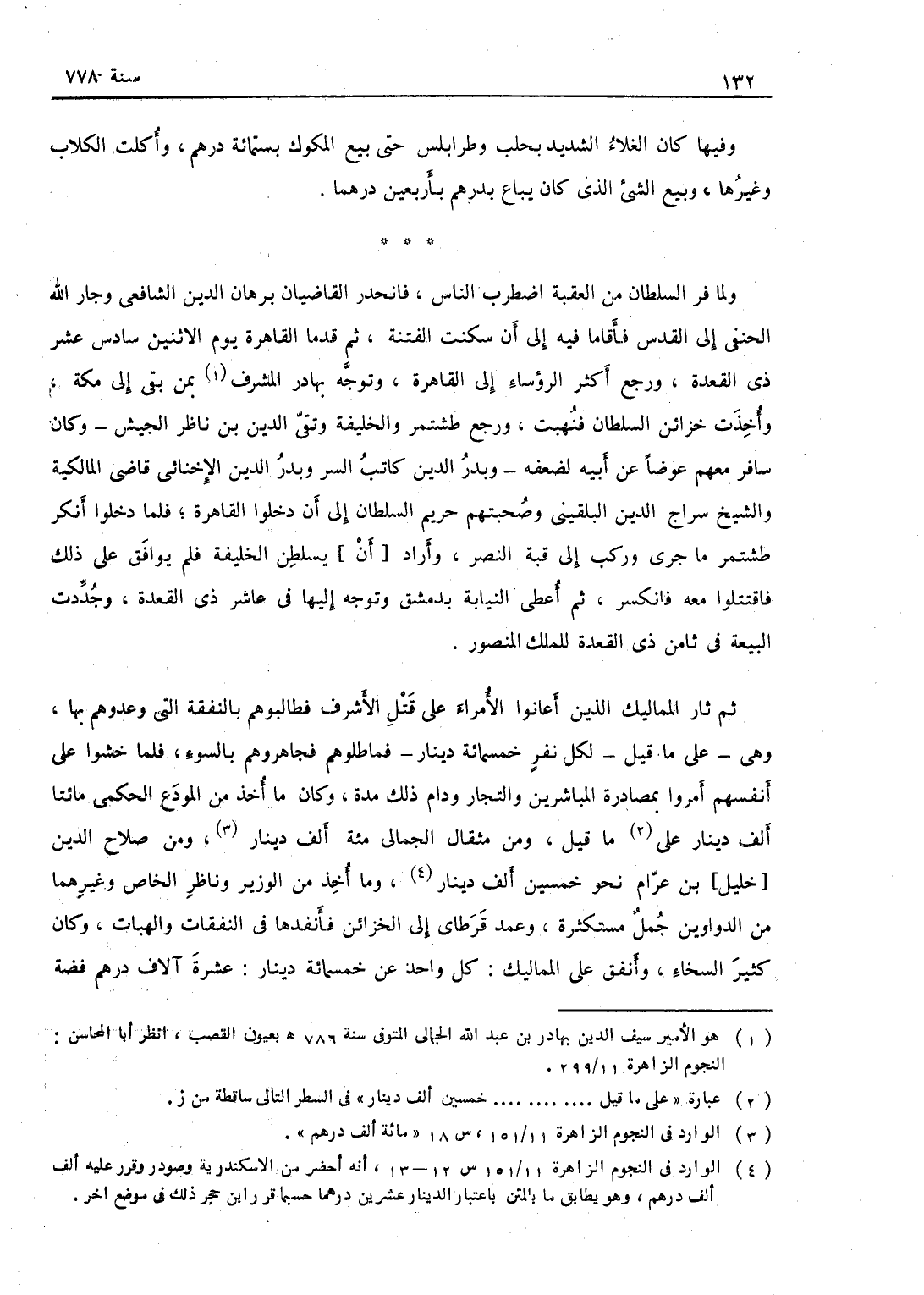 وفيها كان الغلاء الشديد بحلب وطرابلس حتى بيع المكوك بستمائة درهم وأكلت الكلاب وغيرها وبيع الشيء الذي كان يباع بدرهم بأربعين درهماً ولما فر السلطان من العقبة اضطرب الناس فانحدر القاضيان برهان الدين الشافعي وجار الله الحنفي إلى القدس فأقاما فيه إلى أن سكنت الفتنة ثم قدما القاهرة يوم الاثنين سادس عشر ذي القعدة ورجع أكثر الرؤساء إلى القاهرة. وتوجه بهادر المشرف بمن بقي إلى مكة وأخذت خزائن السلطان فنهبت ورجع طشتمر والخليفة وتقي الدين بن ناظر الجيش وكان سافر معهم عوضاً عن أبيه لضعفه وبدر الدين كاتب السر وبدر الدين الأخنائي قاضي المالكية والشيخ سراج الدين البلقيني وصحبتهم حريم السلطان إلى أن دخلوا القاهرة فلما دخلوا أنكر طشتمر ما جرى وركب إلى قبة النصر وأراد أن يسلطن الخليفة فلم يوافق على ذلك فاقتتلوا معه فانكسر ثم أعطى النيابة بدمشق وتوجه إليها في عاشر ذي القعدة. وجددت البيعة في ثامن ذي القعدة للملك المنصور ثم ثار المماليك الذين أعانوا الأمراء على قتل الأشرف فطالبوهم بالنفقة التي وعدوهم بها وهي على ما قيل لكل نفر خمسمائة دينار فماطلوهم فجاهروهم بالسوء فلما خشوا على أنفسهم أمروا بمصادرة المباشرين والتجار ودام ذلك مدة وكان ما أخذ من المودع الحكمي مائتي ألف دينار فيما قيل ومن مثقال الجمالي مائة ألف دينار ومن صلاح الدين بن عرام نحو خمسين ألف دينار وما أخذ من الوزير وناظر الخاص وغيرهما من الدواوين جمل مستكثرة. وعمد قرطاي إلى الخزائن فأنفدها النفقات والهبات وكان كثير السخاء وأنفق على المماليك كل واحد خمسمائة دينار عشرة آلاف درهم فضة
