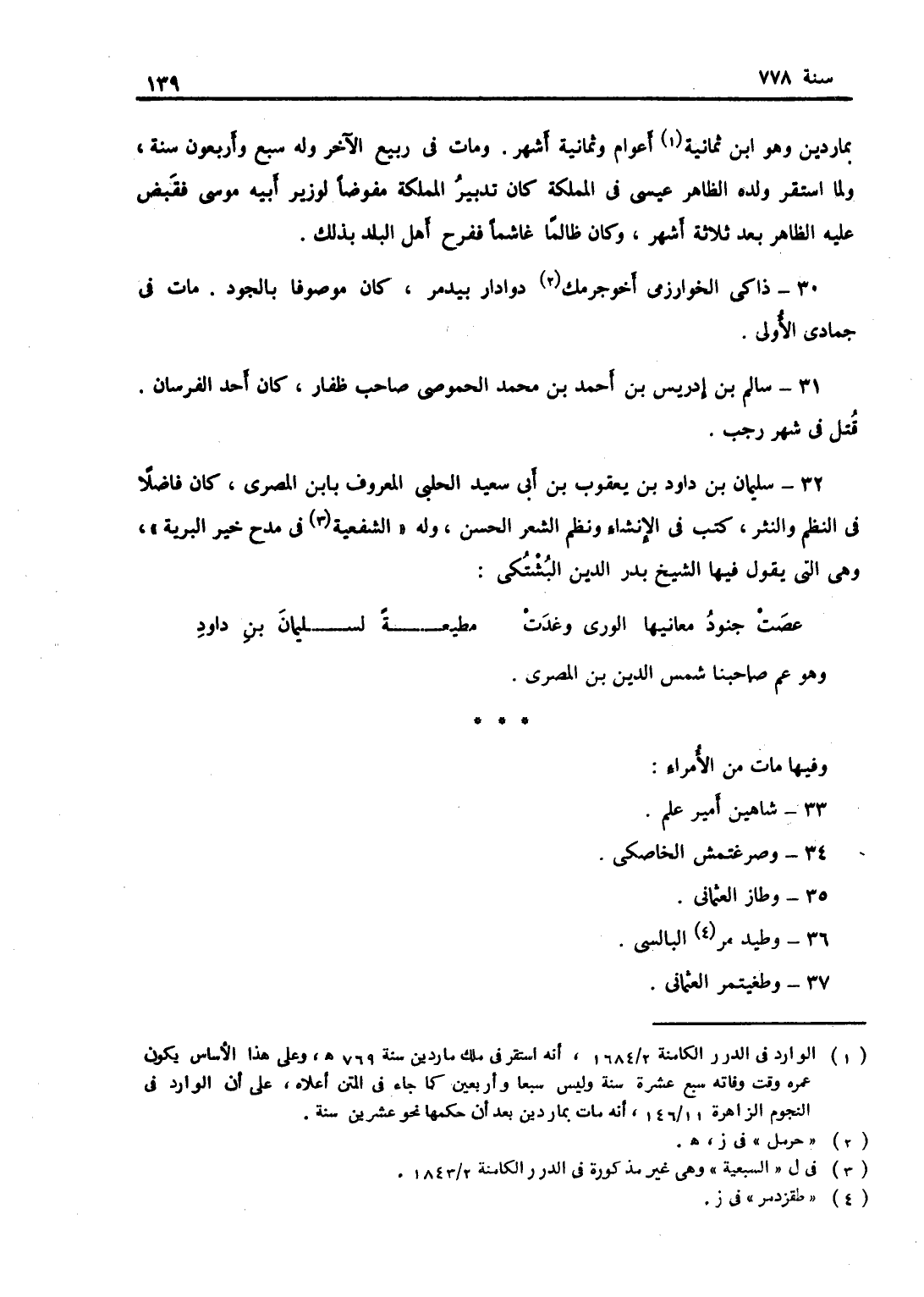 وفيها مات من الأمراء شاهين أمير علم وصرغتمش الخاصكي، وطاز العثماني، وطيدمر البالسي، وطيغتمر العثماني.