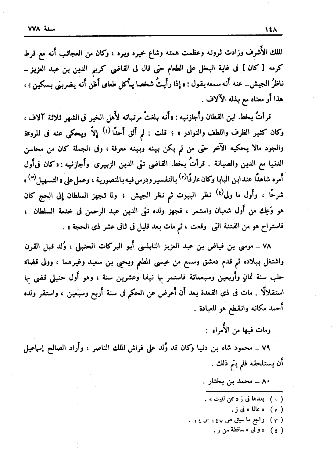 الملك الأشرف، وزادت مروءته وعظمت همته وشاع خيره وبره، وكان من العجائب أنه مع فرط كرمه في غاية البخل على الطعام حتى قال لي القاضي كريم الدين بن عبد العزيز ناظر الجيش عنه إنه سمعه يقول: إذا رأيت شخصاً يأكل طعامي أظن أنه يضربني بسكين هذا أو معناه هذا مع بذله الآلاف، قرأت بخط ابن القطان وأجازنيه أنه بلغت مرتباته لأهل الخير في الشهر ثلاثة آلاف، وكان كثير الظرف واللطف والنوادر.