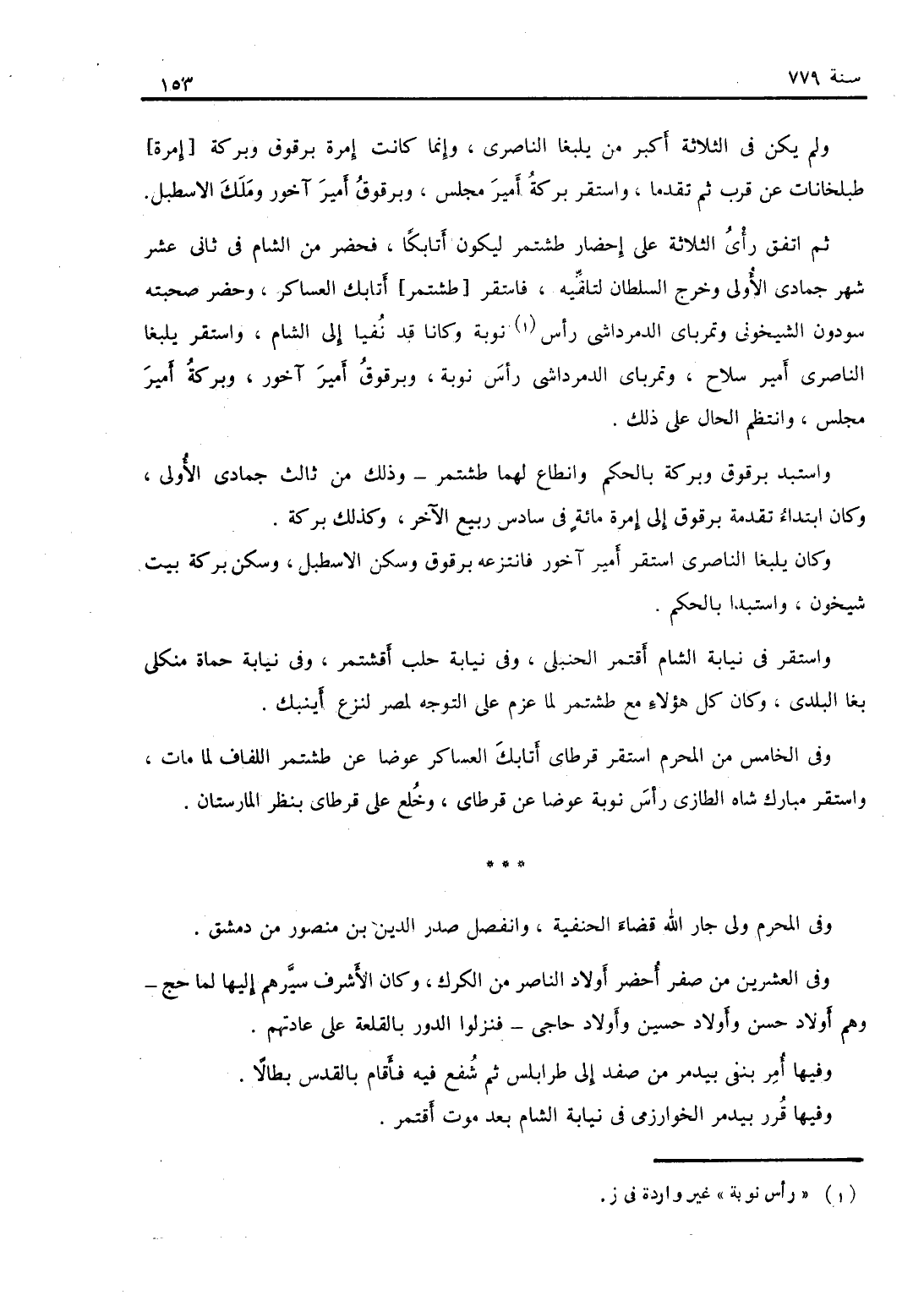 أمير مجلس وانتظم الحال على ذلك واستبد برقوق وبركة بالحكم، وانطاع لهما طشتمر وذلك في ثالث جمادى الأولى، وكان ابتداء تقدمة برقوق إلى إمرة مائة في سادس ربيع الآخر، وكذلك بركة، وكان يلبغا الناصري استقر أمير آخور فانتزعه برقوق وسكن الإصطبل وسكن بركة بيت شيخون واستبد بالحكم واستقر في نيابة الشام آقتمر الحنبلي وفي نيابة حلب اشقتمر وفي نيابة حماة منكلي بغا البلدي، وكان كل هؤلاء مع طشتمر لما عزم على التوجه لمصر لنزع أينبك، وفي الخامس من المحرم استقر قرطاي أتابك العساكر عوضاً عن طشتمر اللفاف لما مات، واستقر مبارك شاه الطازي رأس ولي جار الله قضاء الحنفية وانفصل صدر الدين بن منصور من دمشق، وفي العشرين من صفر أحضر أولاد الناصر من الكرك، وكان الأشرف سيرهم إليها لما حج وهم أولاد حسن وأولاد حسين وأولاد حاجي فنزلوا الدور بالقلعة على عادتهم. ير مجلس وانتظم الحال على ذلك واستبد برقوق وبركة بالحكم، وانطاع لهما طشتمر وذلك في ثالث جمادى الأولى، وكان ابتداء تقدمة برقوق إلى إمرة مائة في سادس ربيع الآخر، وكذلك بركة، وكان يلبغا الناصري استقر أمير آخور فانتزعه برقوق وسكن الإصطبل وسكن بركة بيت شيخون واستبد بالحكم واستقر في نيابة الشام آقتمر الحنبلي وفي نيابة حلب اشقتمر وفي نيابة حماة منكلي بغا البلدي، وكان كل هؤلاء مع طشتمر لما عزم على التوجه لمصر لنزع أينبك، وفي الخامس من المحرم استقر قرطاي أتابك العساكر عوضاً عن طشتمر اللفاف لما مات، واستقر مبارك شاه الطازي رأس ولي جار الله قضاء الحنفية وانفصل صدر الدين بن منصور من دمشق، وفي العشرين من صفر أحضر أولاد الناصر من الكرك، وكان الأشرف سيرهم إليها لما حج وهم أولاد حسن وأولاد حسين وأولاد حاجي فنزلوا الدور بالقلعة على عادتهم.
