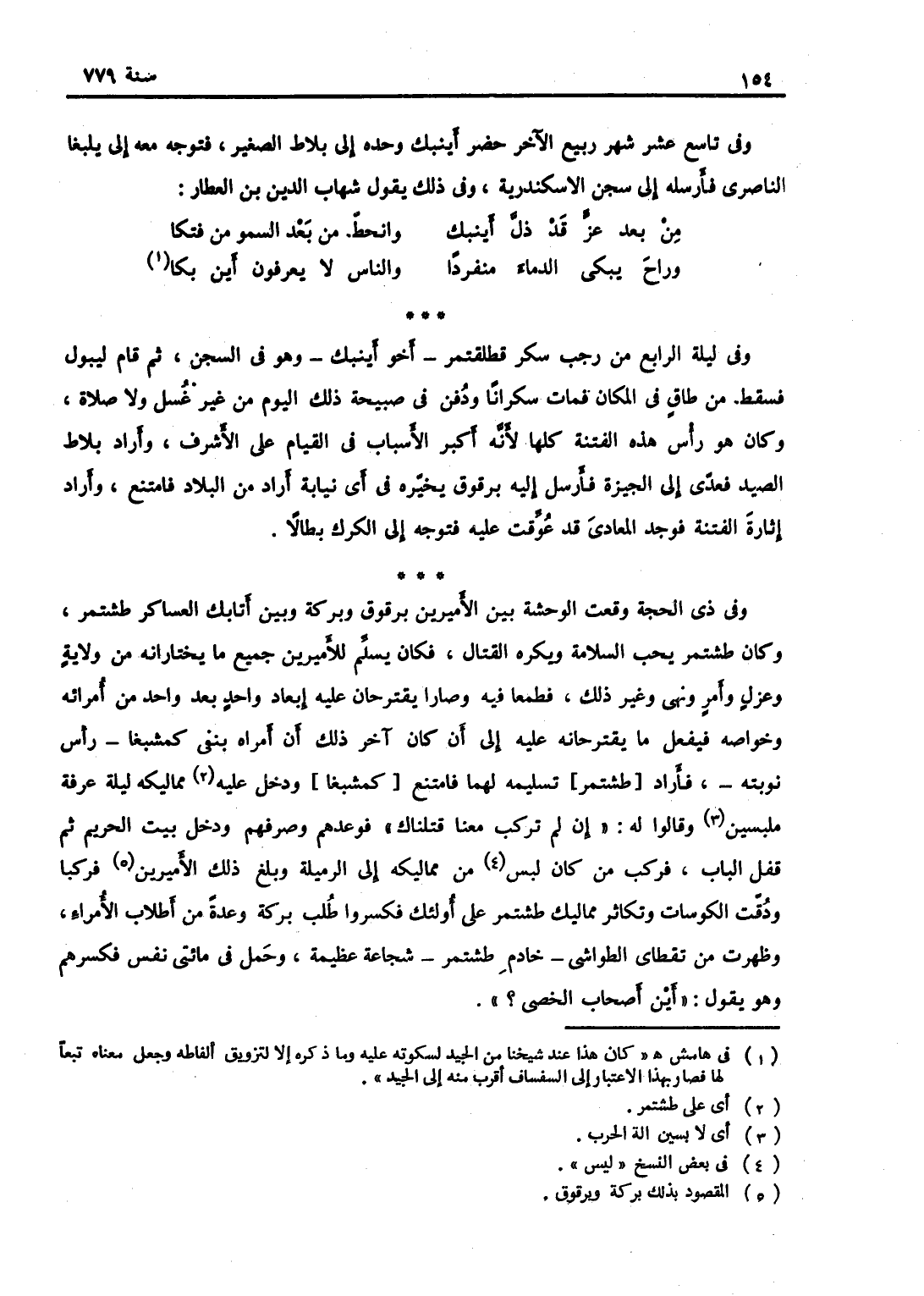 وفي ذي الحجة وقعت الوحشة بين الأميرين برقوق وبركة وبين أتابك العساكر طشتمر، وكان يحب السلامة ويكره القتال، وكان يسلم للأميرين جميع ما يختارانه من ولاية وعزل وأمر ونهى وغير ذلك، فطمعا فيه وصارا يقترحان عليه إبعاد واحد بعد واحد من أمرائه وخواصه فيفعل ما يقترحانه عليه إلى أن كان آخر ذلك أن أمراه بنفي كمشبغا رأس نوبته، فأراد تسليمه لهما فامتنع ودخ عليه مماليكه ليلة عرفة ملبسين وقالوا له: إن لم تركب معنا قتلناك، فوعدهم وصرفهم ودخل إلى بيت الحريم ثم أقفل الباب، فركب من كان لبس من مماليكه إلى الرميلة وبلغ ذلك الأميرين فركبا ودقت الكوسات وتكاثر مماليك طشتمر على أولئك فكسروا طلب بركة وعدة من أطلاب الأكراء وظهرت من تقطاي الطواشي خادم طشتمر شجاعة عظيمة وحمل في مائتي نفس فكسرهم وهو يقول: أين أصحاب الخصى؟