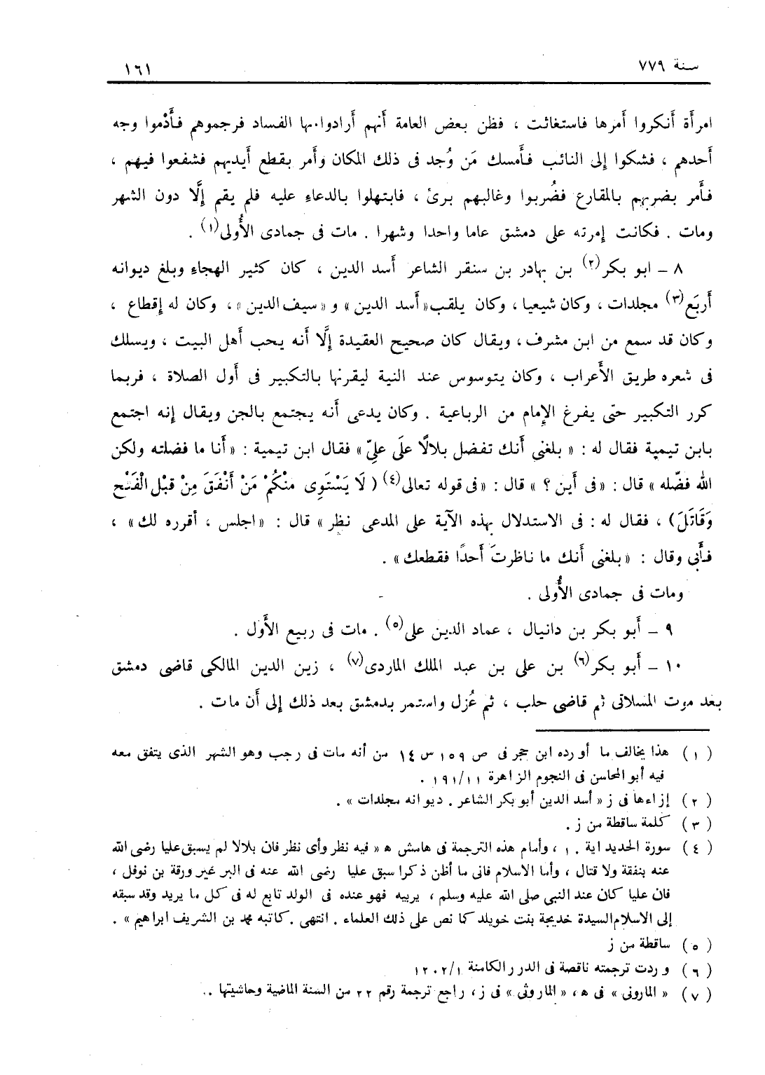 أبو بكر بن بهادر بن سنقر الشاعر أسد الدين، كان كثير الهجاء وبلغ ديوانه مجلدات وكان شيعياً وكان يلقب أسد الدين وسيف الدين وكان له أقطاع وكان قد سمع من ابن مشرف ويقال كان صحيح العقيدة إلا أنه يحب أهل البيت وسلك في شعره طريق الإغراب وكان يوسوس عند النية ليقرنها بالتكبير في أول الصلاة فربما كرر التكبير حتى يفرغ الإمام من الرباعية وكان يدعى أنه يجتمع بالجن ويقال إنه اجتمع بابن تيمية فقال له: بلغني أنك تفضل بلالاً على علي، فقال ابن تيمية: أنا ما فضلته ولكن الله فضله، قال: في أين؟ قال: في قوله تعالى: " لا يستوي منكم من أنفق من قبل الفتح وقاتل ". فقال له: في الاستدلال بهذه الآية على المدعي نظر، قال: اجلس أقرره لك، فأبى وقال:: بلغني أنك ما ناظرت أحداً فقطعك، ومات في جمادى الأولى.