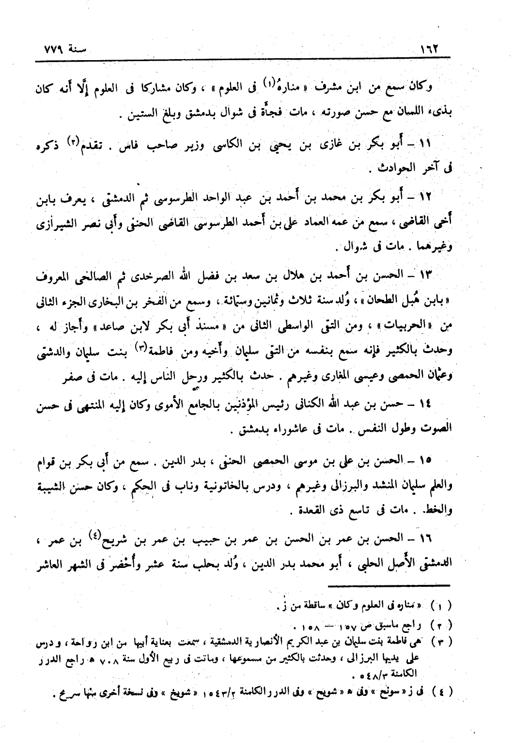 حسن بن عبد الله الكناني رئيس المؤذنين بالجامع الأموي، كان إليه المنتهى في حسن الصوت وطول النفس، مات في عاشوراء بدمشق.