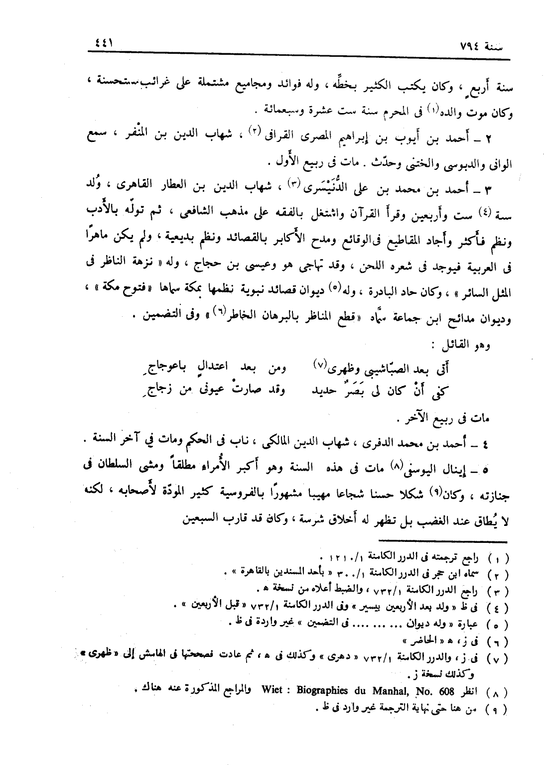 أحمد بن محمد بن علي الدنيسري شهاب الدين ابن العطار القاهري، ولد سنة ست وأربعين وقرأ القرآن، واشتغل بالفقه على مذهب الشافعي ثم تولع بالأدب ونظم فأكثر، وأجاد المقاطيع في الوقائع، ومدح الأكابر بالقصائد، ونظم بديعية، ولم يكن ماهراً في العربية فيوجد في شعره اللحن، وقد تهاجى هو وعيسى بن حجاج وله " نزهة الناظر في المثل السائر " وكان حاد البادرة، وله ديوان قصائد نبوية نظمها بمكة سماها " فتوح مكة " وديوان في مدائح ابن جماعة سماه " قطع المناظر بالبرهان الحاضر " و " الدر الثمين في التضمين " وهو القائل:
