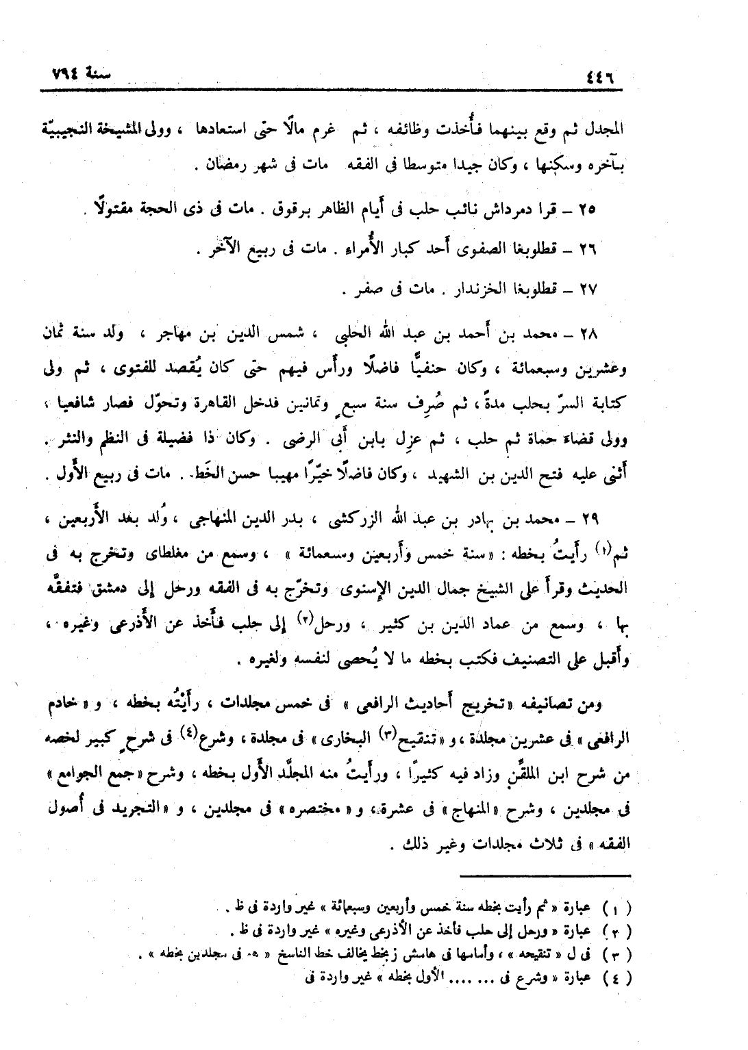 محمد بن بهادر بن عبد الله الزركشي بدر الدين المنهاجي، ولد بعد الأربعين، ثم رأيت بخطه سنة خمس وأربعين وسبعمائة، وسمع من مغلطاي وتخرج به في الحديث، وقرأ على الشيخ جمال الدين الأسنوي وتخرج به في الفقه، ورحل إلى دمشق فتفقه بها، وسمع من عماد الدين ابن كثير، ورحل إلى حلب فأخذ عن الأذرعي وغيره، وأقبل على التصنيف فكتب بخطه ما لا يحصى لنفسه ولغيره، ومن تصانيفه: تخريج أحاديث الرافعي في خمس مجلدات وخادم الرافعي في عشرين مجلدة، وتنقيحه للبخاري في مجلدة، وشرع في شرح كبير لخصه من شرح ابن الملقن، وزاد فيه كثيراً، ورأيت منه المجلد الأول بخطه، وشرح جمع الجوامع في مجلدين وشرح المنهاج في عشرة، ومختصره في مجلدين، والبحر في أصول الفقه في ثلاث مجلدات، وغير ذلك،