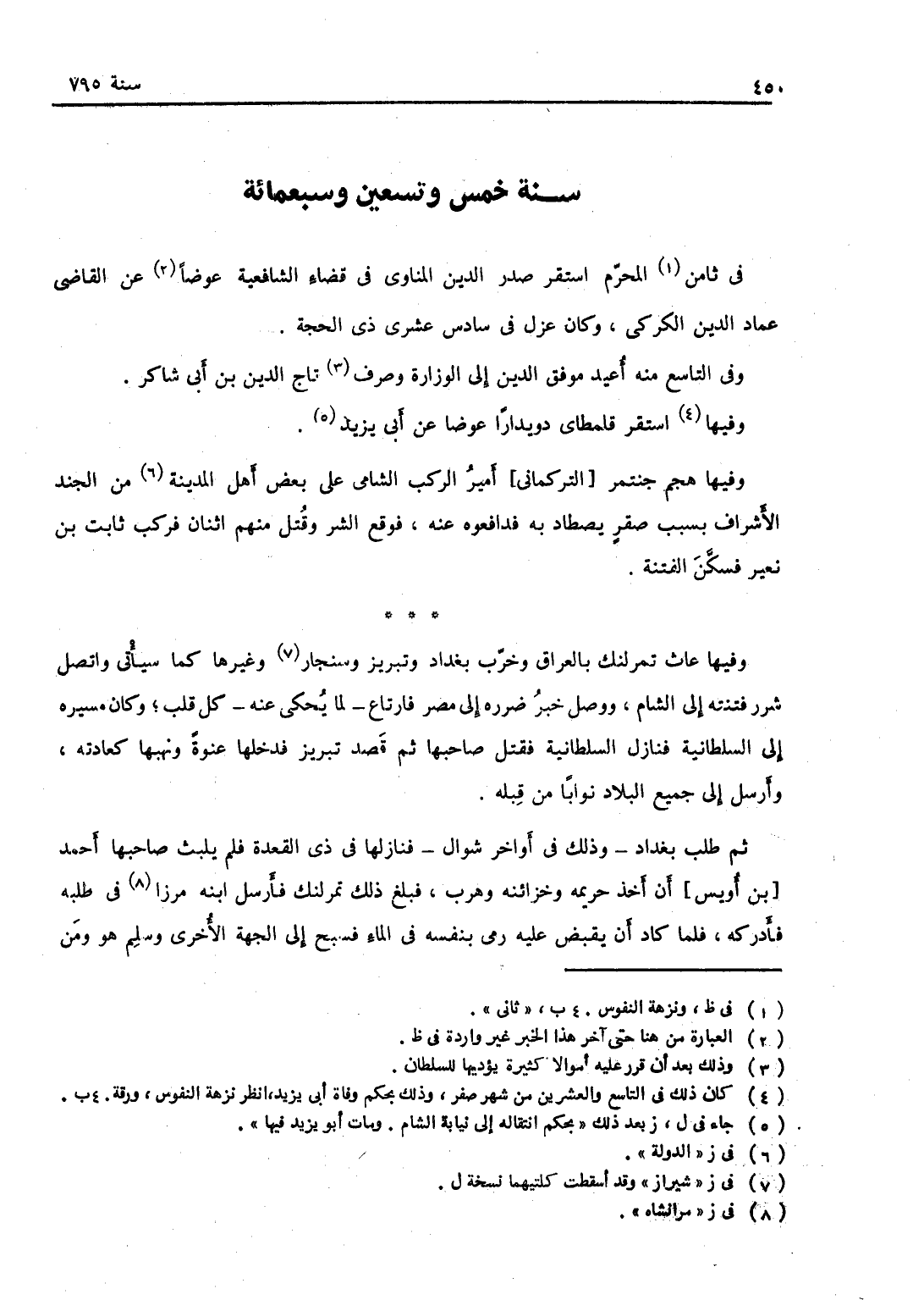 وفيها عاث تمرلنك بالعراق وخرب بغداد وتبريز وشيراز وغيرها كما سيأتي، واتصل شرر فتنته إلى الشام ووصل خبر ضرره إلى مصر، فارتاع لما يحكى عنه كل قلب، فكان مسيره إلى السلطانية فنازل السلطانية فقتل صاحبها، ثم قصد تبريز فدخلها عنوة ونهبها كعادته، وأرسل إلى جميع البلاد نواباً من قبله، ثم طلب بغداد، وذلك في أواخر شوال فنازلها في ذي القعدة، فلم يلبث صاحبها أحمد أن أخذ حريمه وخزائنه وهرب، فبلغ ذلك تمر فأرسل ابنه مرزا في طلبه فأدركه، فلما كاد أن يقبض عليه رمى بنفسه في الماء، فسبح إلى الجهة الأخرى فسلم هو ومن