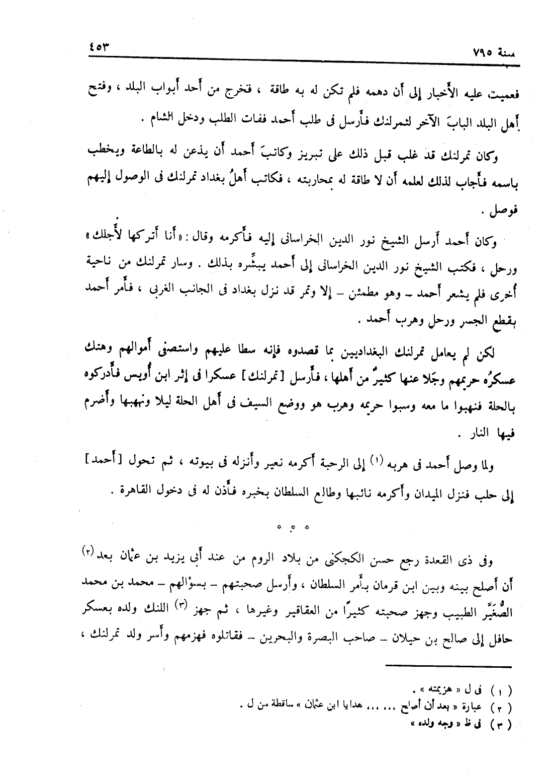 فعميت عليه الأخبار إلى أن دهمه فلم يكن له به طاقة فخرج من أحد أبواب البلد، وفتح أهل البلد الباب الآخر لتمرلنك، فأرسل في طلب أحمد ففات الطلب ودخل الشام، وكان تمرلنك قد غلب قبل ذلك على تبريز وكاتب أحمد أن يذعن له بالطاعة ويخطب باسمه، فأجاب لذلك لعلمه بأن لا طاقة له بمحاربته، فكاتب أهل بغداد تمرلنك في الوصول إليهم فوصل، وكان أحمد أرسل الشيخ نور الدين الخراساني إلى تمر فأكرمه، وقال أنا أتركها لأجلك ورحل، فكتب الشيخ نور الدين الخراساني إلى أحمد يبشره بذلك، وسار تمر من ناحية أخرى فلم يشعر أحمد وهو مطمئن إلا وتمر قد نزل بغداد في الجانب الغربي فأمر أحمد بقطع الجسر ورحل وهرب أحمد لكن لم يعامل تمرلنك البغداديين بما قصدوه، فإنه سطا عليهم واستصفى أموالهم وهتك عسكره حريمهم، وخلا عنها كثير من أهلها وأرسل عسكراً في أثر ابن أويس فأدركه بالحلة فنهبوا ما معه وسبوا حريمه وهرب هو ووضع السيف في أهل الحلة ليلاً ونهبوها وأضرم فيها النار، ولما وصل أحمد في هربه إلى الرحبة أكرمه نعير وأنزله في بيوته ثم تحول إلى حلب فنزل الميدان وأكرمه نائبها وطالع السلطان بخبره، فأذن له في دخوله القاهرة.