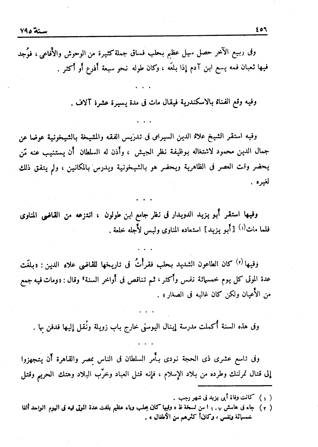 وفي ربيع الآخر حصل سيل عظيم بحلب فساق جملة كثيرة من الوحوش والأفاعي فوجد فيها ثعبان عظيم يسع فمه ابن آدم إذا ابتلعه وكان طوله نحو سبعة أذرع أو أكثر.