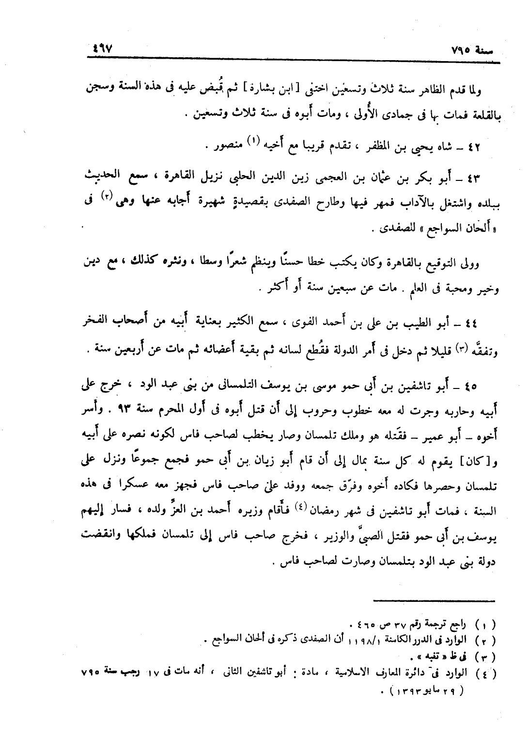 أبو تاشفين ابن أبي حمو موسى بن يوسف التلمساني من بني عبد الواد، خرج على أبيه وحاربه وجرت له معه خطوب وحروب إلى أن قتل أبوه في المحرم سنة 92، وأسر أخوه أبو عمر فقتله هو وملك تلمسان وصار يخطب لصاحب فاس لكونه نصره على أبيه ويقوم له كل سنة بمال إلى أن قام أبو زيان بن أبي حمو فجمع جموعاً ونزل على تلمسان وحصرها فكاده أخوه وفرق جمعه ووفد على صاحب فاس فجهز معه عسكراً في هذه السنة، فمات أبو تاشفين في شهر رمضان، فأقام وزيره أحمد ابن العز ولده فسار إليهم يوسف بن أبي حمو فقتل الصبي والوزير فخرج صاحب فاس إلى تلمسان فملكها وانقضت دولة بني عبد الواد بتلمسان وصارت لصاحب فاس.