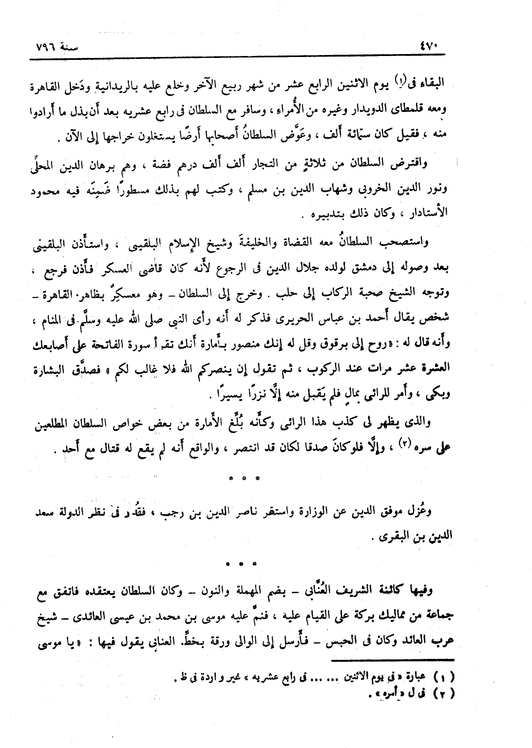 البقاء في يوم الاثنين الرابع عشر من شهر ربيع الآخر وخلع عليه بالريدانية ودخل القاهرة ومعه قلمطاي الدويدار وغيره من الأمراء، وسافر مع السلطان في رابع عشريه بعد أن بذل ما أرادوا منه فقيل: كان ستمائة ألف، وعوض السلطان أصحابها أرضاً يستغلون خراجها إلى الآن، واقترض السلطان من ثلاثة من التجار ألف ألف درهم فضة، وهم برهان الدين المحلى ونور الدين الخروبي وشهاب الدين ابن مسلم، وكتب لهم بذلك مسطوراً ضمنه فيه محمود الاستادار، وكان ذلك بتدبيره، واستصحب السلطان معه القضاة والخليفة وشيخ الإسلام البلقيني، واستأذن البلقيني بعد وصوله إلى دمشق لولده جلال الدين في الرجوع لأنه كان قاضي العسكر، فأذن له فرجع وتوجه الشيخ صحبة الركاب إلى حلب، وخرج إلى السلطان وهو معسكر ظاهر القاهرة شخص يقال له أحمد بن عباس الحريري، فذكر أنه رأى النبي صلى الله عليه وسلم تسليماً في المنام وأنه قال له: رح إلى برقوق وقل له إنك منصور بأمارة أنك تقرأ سورة الفاتحة على أصابعك العشرة عشر مرات عند الركوب ثم تقول " إن ينصركم الله فلا غالب لكم " فصدق الأمارة وبكى وأمر للرأي بمال فلم يقبل منه إلا نذراً يسيراً، والذي يظهر لي كذب هذا الرأي، وكأنه بلغ الأمارة من بعض خواص السلطان المطلعين على سره، وإلا فلو كان صدقاً لكان قد انتصر، والواقع أنه لم يقع له قتال مع أحد، وعزل موفق الدين عن الوزارة واستقر ناصر الدين ابن رجب فقرر في نظر الدولة سعد الدين ابن البقري.
