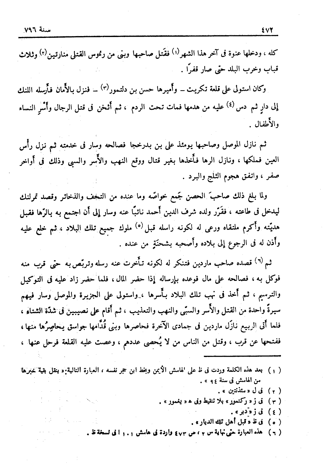 كله ودخلها عنوة في آخر هذا الشهر فقتل صاحبها، وبنى من رؤوس القتلى منارتين وثلاث قباب، وخرب البلد حتى صارت قفرة، وكان استولى على قلعة تكريت وأميرها حسن بن يغمور ونزل بالأمان فأرسله اللنك إلى دار ثم دس عليه من هدمها، فمات تحت الهدم، ثم أثخن في قتل الرجال وأسر النساء والأطفال، ثم نازل الموصل وصاحبها يومئذ يار علي بن برد خجا فصالحه وصار في خدمته، ثم نزل إلى رأس عين فملكها، ونازل الرها فأخذها بغير قتال، ووقع النهب والأسر والسبي، وذلك في آخر صفر واتفق هجوم الثلج والبرد، ولما بلغ ذلك صاحب الحصن جمع خواصه وما عنده من التحف والذخائر وقصد تمرلنك ليدخل في طاعته فقرر ولده شرف الدين أحمد نائباً عنه، وسار إلى أن اجتمع به بالرها فقبل هديته وأكرم ملتقاه ورعى له لكونه راسله قبل جميع تلك البلاد، ثم خلع عليه وأذن له في الرجوع إلى بلاده وأصحبه بشحنة من عنده، ثم قصده صاحب ماردين فتنكر له لكونه تأخرت عنه رسله وتربص به حتى قرب منه فوكل به فصالحه على مال فوعده بإرساله إذا حضر المال فلما حضر زاد عليه في التوكيل والترسيم، ثم أخذ في نهب تلك البلاد بأسرها، واستولى على بلاد الجزيرة والموصل وسار فيهم سيرة واحدة من القتل والأسر والسبي والنهب والتعذيب ثم أقام على نصيبين في شدة الشتاء، فلما أتى الربيع نازل ماردين في جمادى الآخرة فحاصرها وبنى قدامها جواسق فحاصرها منها ففتحها عن قرب، وقتل من الناس من لا يحصى عددهم، وعصت عليه القلعة فرحل عنها