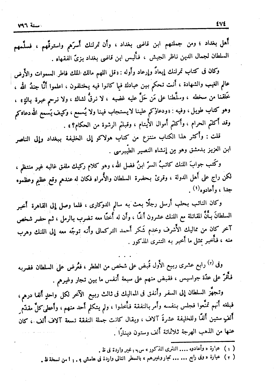 أهل بغداد، ومن جملتهم ابن قاضي بغداد، وإن تمرلنك أسرهم واسترقهم، فسلمهم السلطان لجمال الدين ناظر الجيش فألبس ابن قاضي بغداد بزي الفقهاء، وكان في كتاب تمرلنك إيعاد وإرعاد وأوله: " قل اللهم فاطر السموات والأرض عالم الغيب والشهادة أنت تحكم بين عبادك فيما كانوا فيه يختلفون " اعلموا " أنا جند الله "، خلقنا من سخطه وسلطنا على من حل عليه غضبه لا نرق لشاكي ولا نرحم عبرة باكي " وهو كتاب طويل وفيه " ودعاؤكم علينا لا يستجاب فينا ولا يسمع، فكيف يسمع الله دعاؤكم وقد أكلتم الحرام وأكلتم أموال الأيتام وقبلتم الرشوة من الحكام " قلت: وأكثر هذا الكتاب منتزع من كتاب هولاكو إلى الخليفة ببغداد وإلى الناصر بن العزيز بدمشق وهو من إنشاء النصير الطوسي، وكتب جواب اللنك كاتب السر ابن فضل الله وهو كلام ركيك ملفق غالبه غير منتظم لكنه راج على أهل الدولة، وقريء بحضرة السلطان والأمراء فكان له عندهم وقع عظيم وعظموه جداً وأعادوه، وكان النائب بحلب أرسل رجلاً بعث به سالم الدوكاري فلما وصل إلى القاهرة أخبر السلطان أن المقاتلة مع اللنك عشرون ألفاً وأن له أختاً معه تضرب بالرمل، ثم حضر شخص آخر كان من مماليك الأشرف وخدم شكر أحمد التركماني وأنه توجه معه إلى اللنك فهرب منه فأخبر بمثل ما أخبر به التتري المذكور.