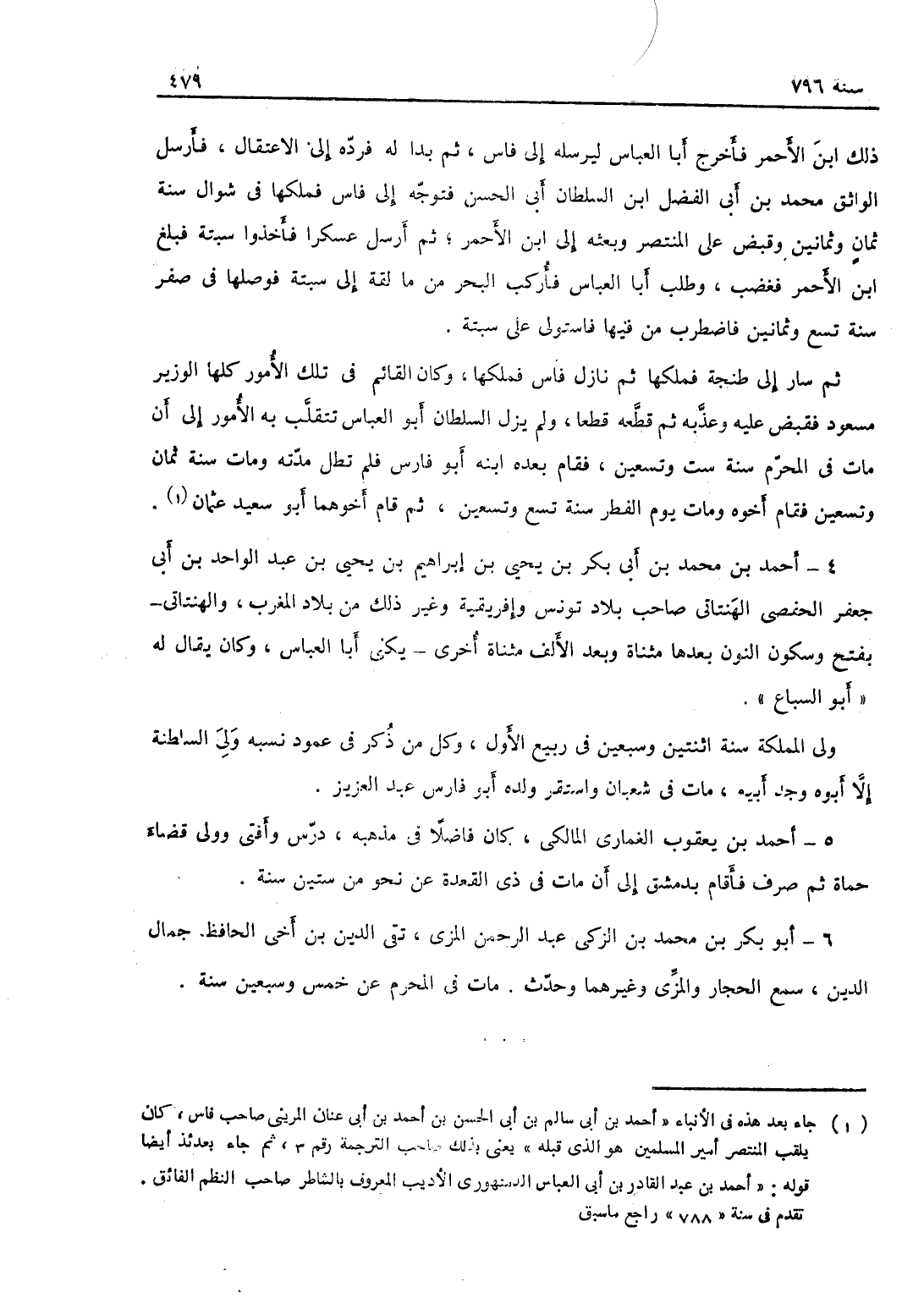 ذلك ابن الأحمر فأخرج أبا العباس ليرسله إلى فاس، ثم بذا له فرده إلى الاعتقال فأرسل الواثق محمد بن أبي الفضل ابن السلطان أبي الحسن فتوجه إلى فاس فملكها في شوال سنة ثمان وثمانين وقبض على المنتصر فبعثه إلى ابن الأحمر ثم أرسل عسكراً فأخذوا سبتة فبلغ ابن الأحمر فغضب وطلب أبا العباس فأركبه البحر من مألقة إلى سبتة فوصلها في صفر سنة تسع وثمانين فاضطرب من فيها، واستولى على سبتة ثم سار إلى طنجة فملكها، ثم نازل فاس فملكها، وكان القائم في تلك الأمور كلها الوزير مسعود فقبض عليه وعذبه ثم قطعه قطعاً ولم يزل السلطان أبو العباس تتقلب به الأمور إلى أن مات في المحرم سنة ست وتسعين، فقام بعده ابنه أبو فارس فلم تطل مدته، ومات سنة ثمان وتسعين فقام أخوه ومات في يوم الفطر سنة تسع وتسعين، ثم قام أخوهما أبو سعيد عثمان.