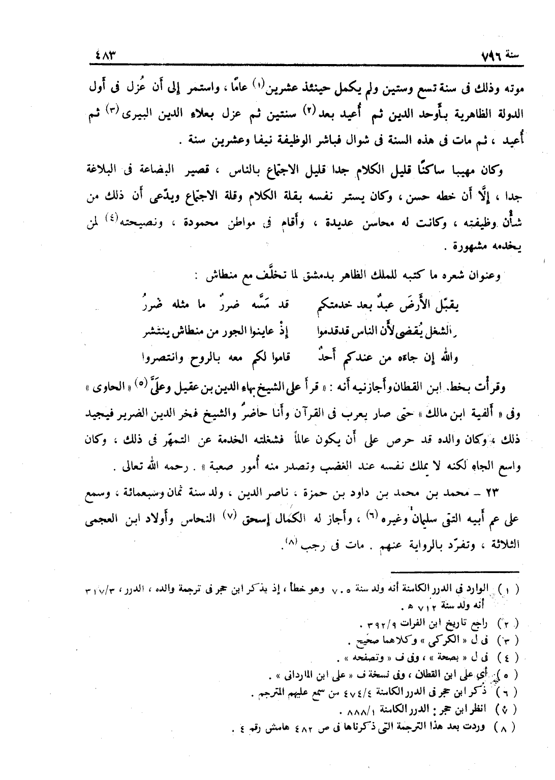 موته وذلك في رمضان سنة تسع وستين، ولم يكمل حينئذ عشرين سنة، واستمر إلى أن عزل في أول الدولة الظاهرية بأوحد الدين، ثم أعيد بعد سنتين، ثم عزل بعلاء الدين الكركي، ثم أعيد ثم مات في هذه السنة في شوال، فباشر الوظيفة نيفاً وعشرين سنة، وكان مهيباً ساكناً قليل الكلام جداً قليل الاجتماع بالناس قصير البضاعة في البلاغة جداً إلا أن خطه حسن، وكان يستر نفسه بقلة الكلام وقلة الاجتماع. وكان يدعي أن ذلك من شأن وظيفته، وكانت له محاسن عديدة، وقام في مواطن محمودة، ونصيحته لمن يخدمه مشهورة، وعنوان شعره ما كتبه للملك الظاهر من دمشق لما تخلف مع منطاش: