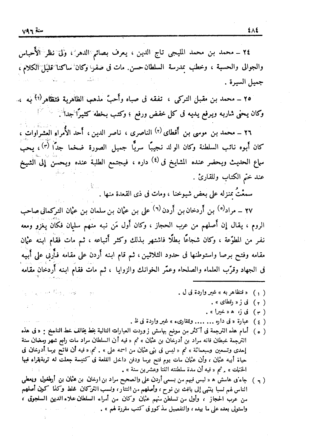 مراد بن اورخان بن أردن علي بن عثمان بن سلمان بن عثمان التركماني صاحب الروم يقال إن أصلهم من عرب الحجاز وكان أول من نبه منهم سلمان فكان يغزو ومعه نفر من المطوعة وكان شجاعاً بطلاً فاشتهر بذلك وكثر أتباعه ثم مات، فقام ابنه عثمان مقامه، وفتح برسا واستوطنها في حدود الثلاثين ثم مات، فقام ابنه عثمان مقامه، وفتح برسا واستوطنها في حدود الثلاثين ثم قام ابنه أردن على مقامه فأربى على أبيه في الجهاد، وقرب العلماء والصلحاء وعمر الخوانك والزوايا ثم مات، فقام ابنه أورخان مكانه