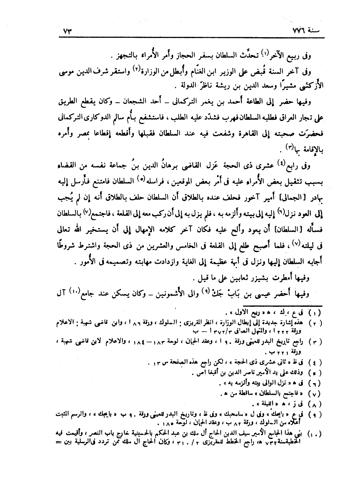 وفي رابع عشرين ذي الحجة عزل القاضي برهان الدين بن جماعة نفسه من القضاء بسبب تثقيل بعض الأمراء عليه في أمر بعض الموقعين، فراسله السلطان فامتنع، فأرسل إليه بهادر أمير آخور فخلف عنده بالطلاق أن السلطان حلف بالطلاق أنه إن لم يجب إلى العود نزل إلى بيته وألزمه به، ولم يزل به إلى أن ركب معه إلى القلعة فاجتمع بالسلطان فسأله أن يعود وألح عليه، فكان آخر كلامه الإمهال إلى أن يستخير الله تعالى في الليلة، فلما أصبح طلع إلى القلعة في الخامس والعشرين من ذي الحجة واشترط شروطاً أجابه السلطان إليها، ونزل في أبهة عظيمة إلى الغاية، وازدادت مهابته وتصميمه في الأمور.