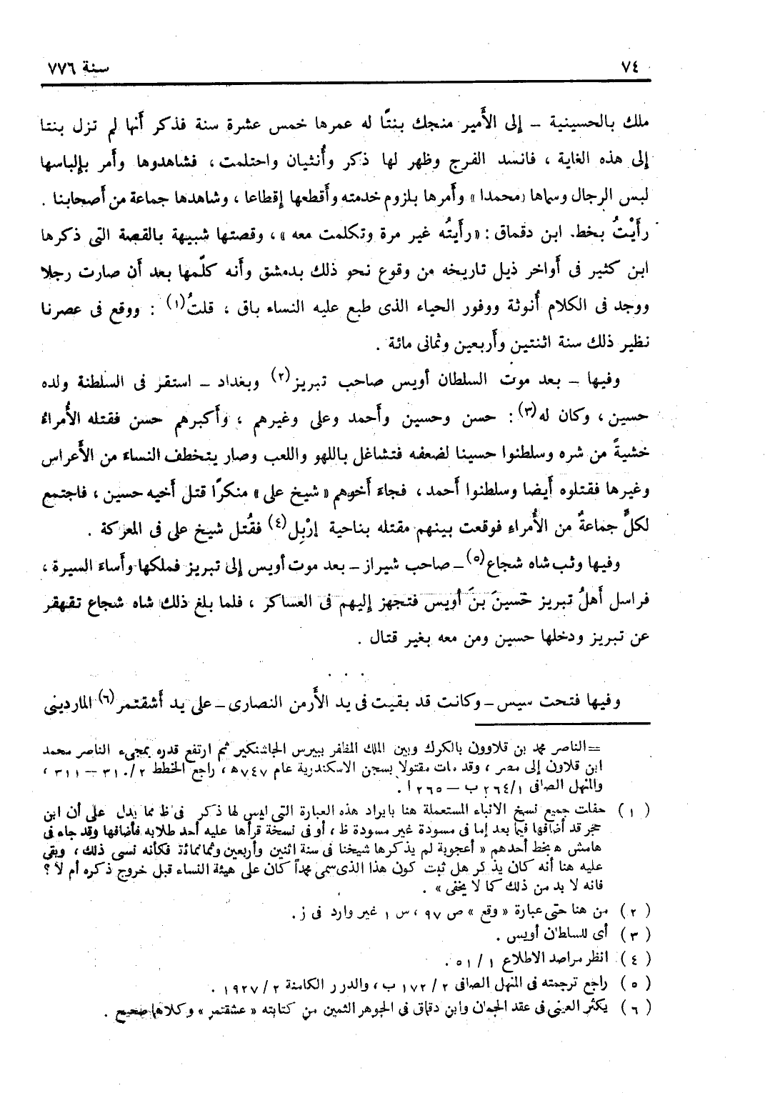 وفيها بعد موت السلطان أويس صاحب تبريز وبغداد استقر في السلطنة ولده حسين، وكان له حسن وحسين وأحمد وعلي وغيرهم، وأكبرهم حسن فقتله الأمراء خشية من شره، وسلطنوا حسيناً لضعفه، فتشاغل باللهو واللعب، وصار يخطف النساء من الأعراس وغيرها، فقتلوه أيضاً وسلطنوا أحمد، فجاء أخوهم شيخ على منكراً قتل أخيه حسن، فاجتمع لكل جماعة من الأمراء، فوقعت بينهم مقتلة بناحية أربل، فقتل شيخ علي في المعركة.