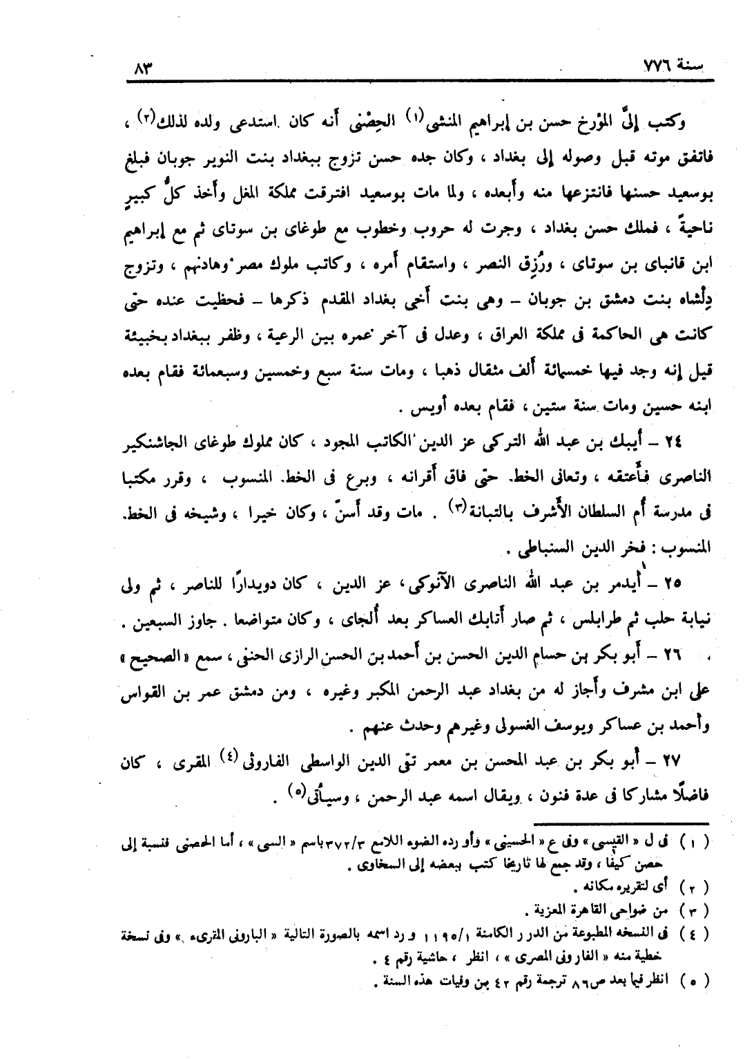 وكتب إلى المؤرخ حسن بن إبراهيم الحسيني الحصني أنه كان استدعى ولده لذلك، فاتفق موته قبل وصوله إلى بغداد، وكان جده حسين تزوج بغداد بنت النوين جوبان، فبلغ أبو سعيد حسنها فانتزعها منه وأبعده، ولما مات أبو سعيد افترقت مملكة المغل وأخذ كل كبير ناحيةً فملك حسين بغداد، وجرت له حروب وخطوب مع طغاي بن سوتاي ثم مع إبراهيم بن بارنباي بن سوتاي، ورزق النصر واستقام أمره، وكاتب ملوك مصر وهادنهم. وتزوج دلشاد بنت دمشق بن جوبان وهي بنت أخي بغداد المقدم ذكرها، فحظيت عنده حتى كانت هي الحاكمة في مملكة العراق، وعدل في آخر عمره بين الرعية، وظفر في بغداد بخبيئة، قيل إنه وجد فيها خمسمائة ألف مثقال ذهباً، ومات سنة سبع، وخمسين وسبعمائة، فقام بعده ابنه حسين، ومات سنة ستين، فقام بعده أويس.