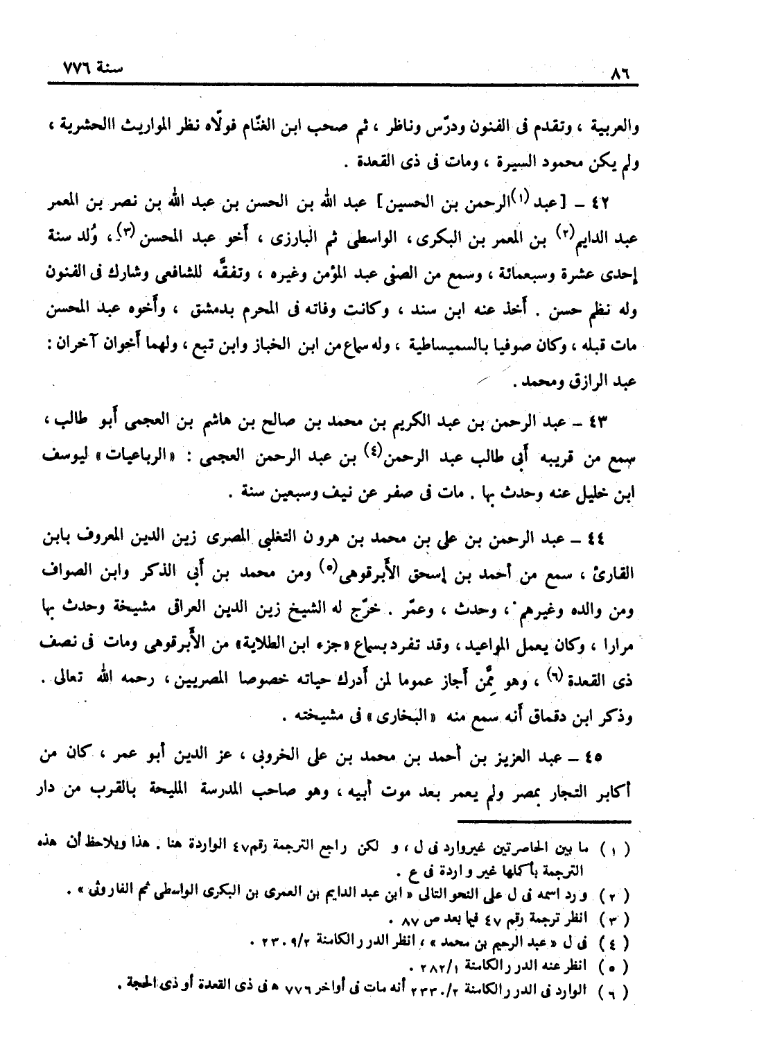 عبد الرحمن بن الحسين بن عبد الله بن نصر بن المعمر بن عبد الكريم بن المعمر البكري الواسطي ثم الفاروثي، أخو عبد المحسن، ولد سنة إحدى عشرة وسبعمائة، وسمع من الصفي عبد المؤمن وغيره، وتفقه للشافعي وشارك في الفنون، وله نظم حسن، أخذ عنه ابن سند، وكانت وفاته في المحرم بدمشق، وأخوه عبد المحسن مات قبله، وكان صوفياً بالشميساطية، وله سماع من ابن الخباز وابن تبع، ولهما أخوان آخران: عبد الرزاق ومحمد.
